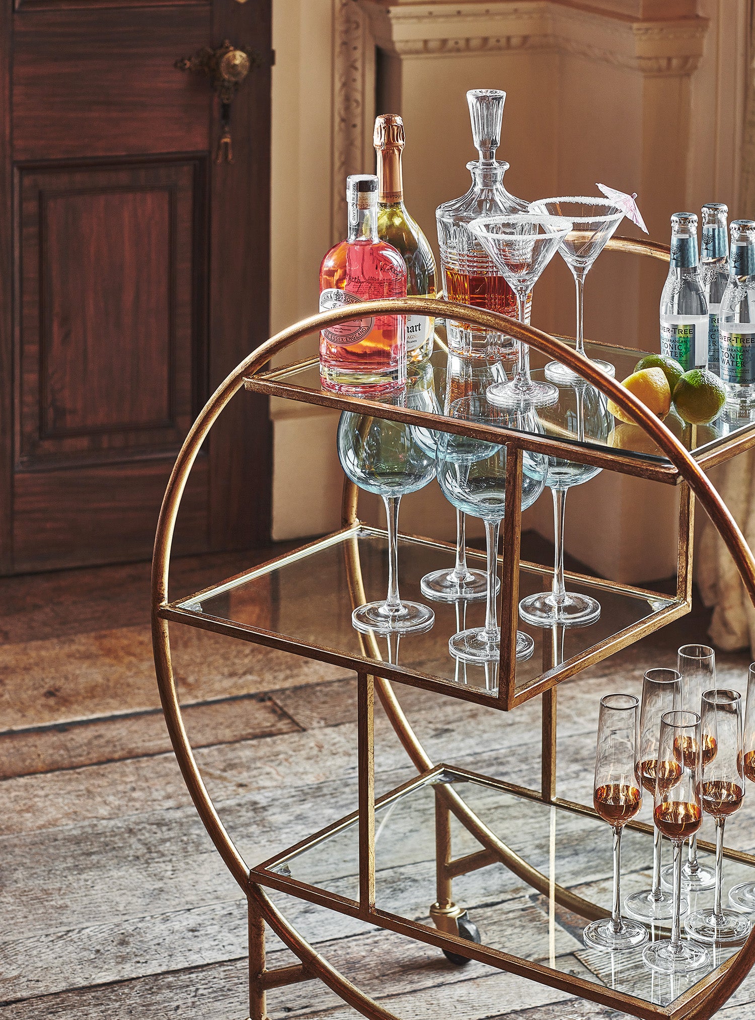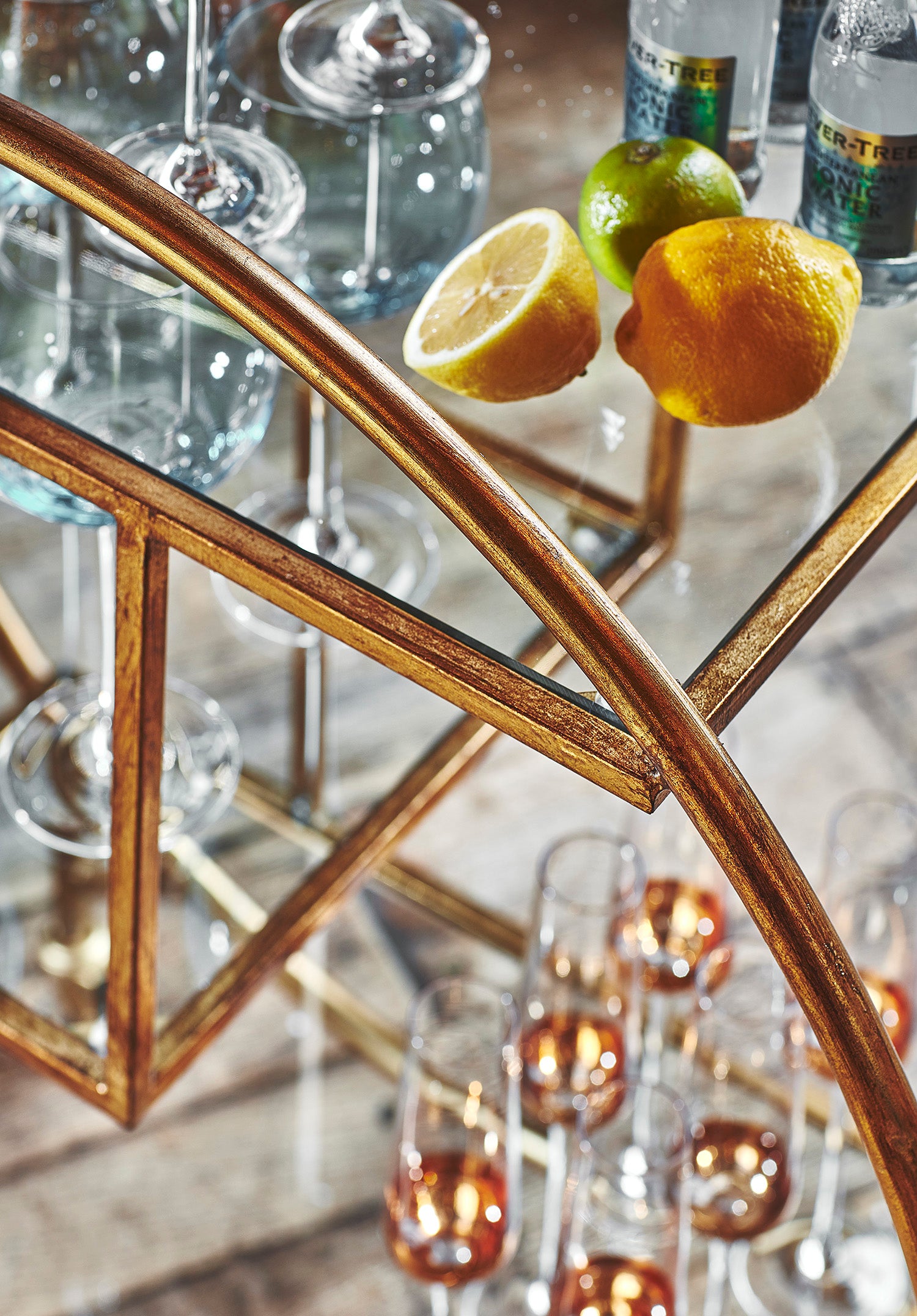 Be prepared to be impressed with the Verian Bar Trolley. It is an elegant example of art deco style that is so chic at the moment. It is a huge, round double wheel. Its burnished metal frame is so attractive and extends to the shelving area. Three glass shelves, perfectly aligned for maximum usage. What about one for the bottles, one for the glasses and one for the extras? It is easy to move around as you wish thanks to the added bonus of wheels. Wherever you plan to place it, a positive impression will be made. Make it your luxurious centrepiece every day.