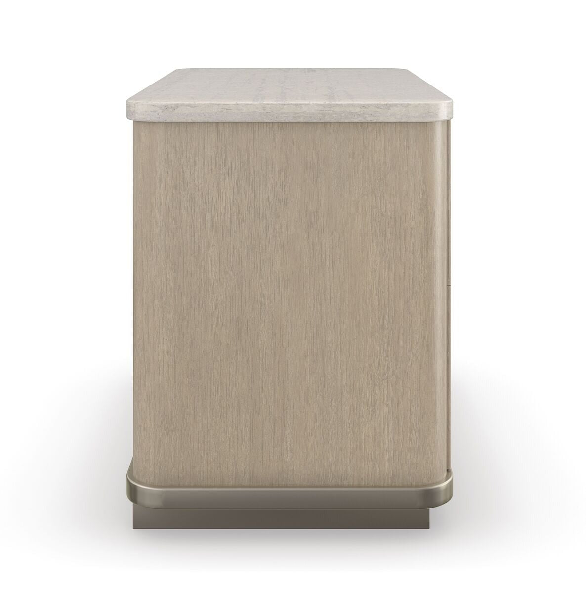 Set on a slender base with a warm metallic finish, this piece is crafted with a Sun Drenched oak finish ribbed detailing that adds depth and texture. The cream travertine top offers a luxurious surface, perfect for a lamp, books, or decorative accents. Two soft-close drawers provide discreet storage to help keep your space clutter-free.