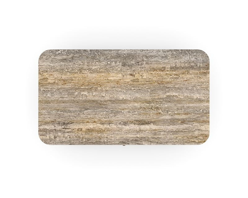 Set on a slender base with a warm metallic finish, this piece is crafted from ash wood with a rich black stain and ribbed detailing that adds depth and texture. The dark travertine top offers a luxurious surface, perfect for a lamp, books, or decorative accents. Two soft-close drawers provide discreet storage to help keep your space clutter-free.