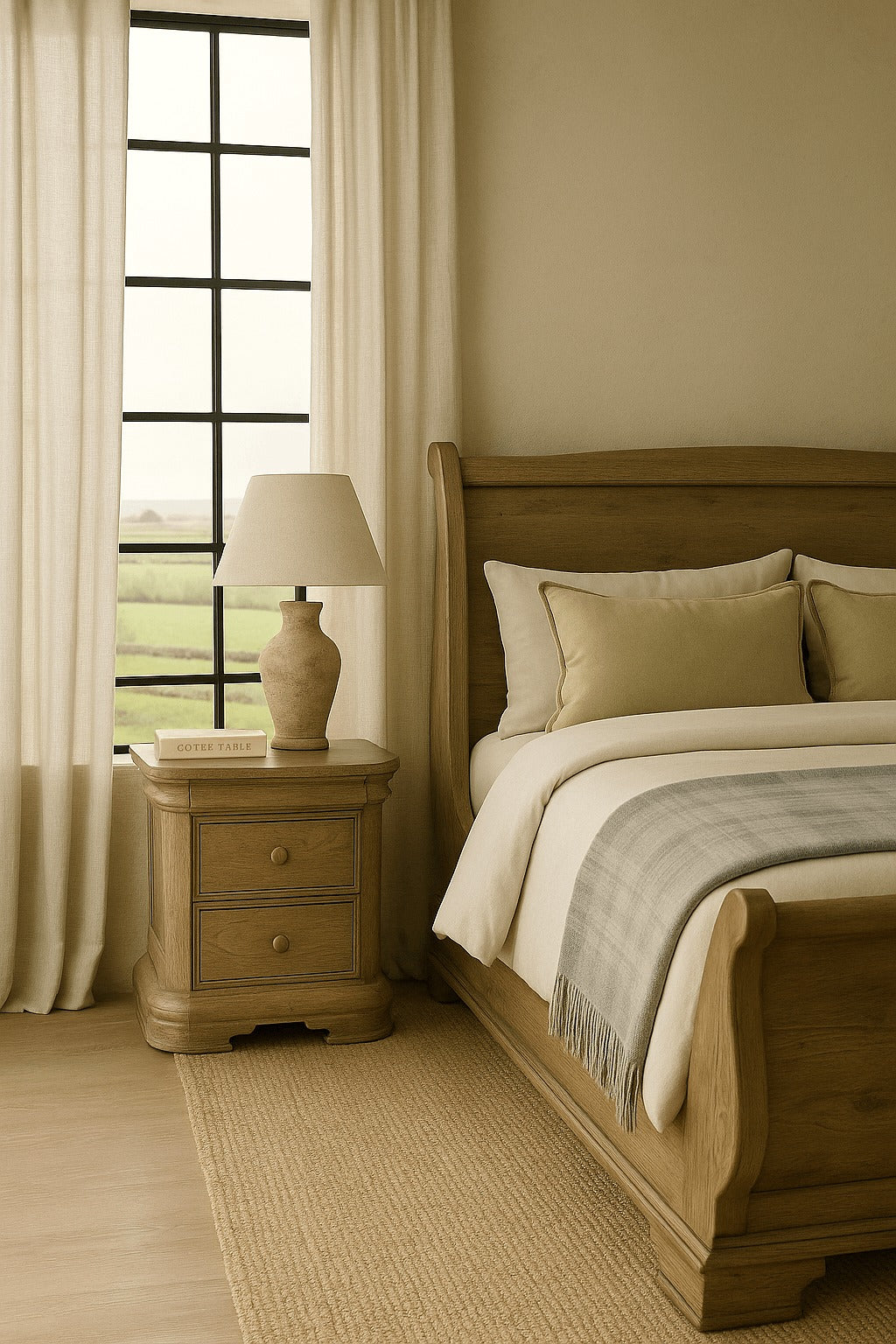 Expertly crafted from oak with a soft natural finish, this piece highlights the wood’s beautiful grain and texture. Its gracefully curved edges, moulded detailing and sculptural feet lend an air of traditional elegance, while two spacious drawers and a felt‑lined jewellery drawer offer practical storage for night‑time essentials. Finished with simple brass knobs, the design strikes a perfect balance between heritage style and everyday function.