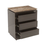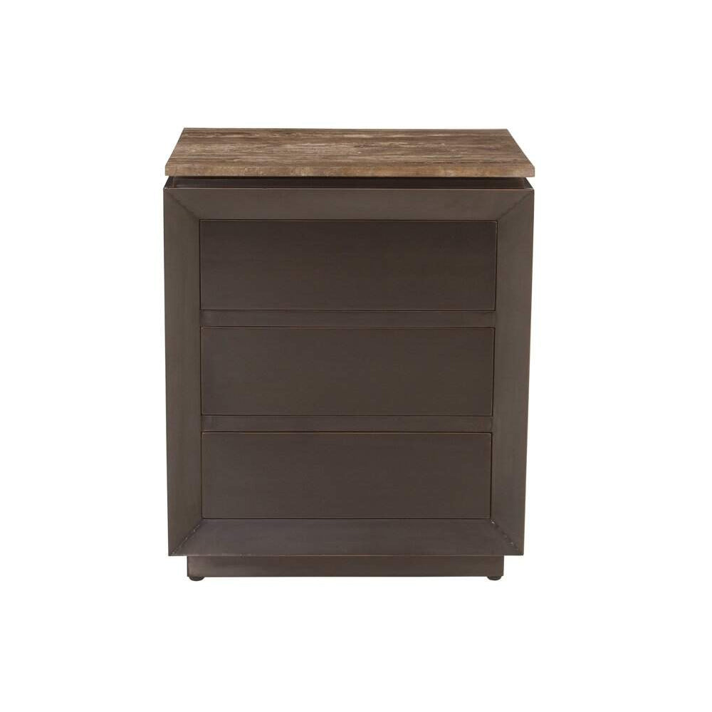 Topped with rich brown travertine, it offers an organic, tactile touch, while the dark brown brass‑plated frame adds sleek, modern edge. Three generous drawers provide ample storage, keeping essentials close at hand without compromising on style.