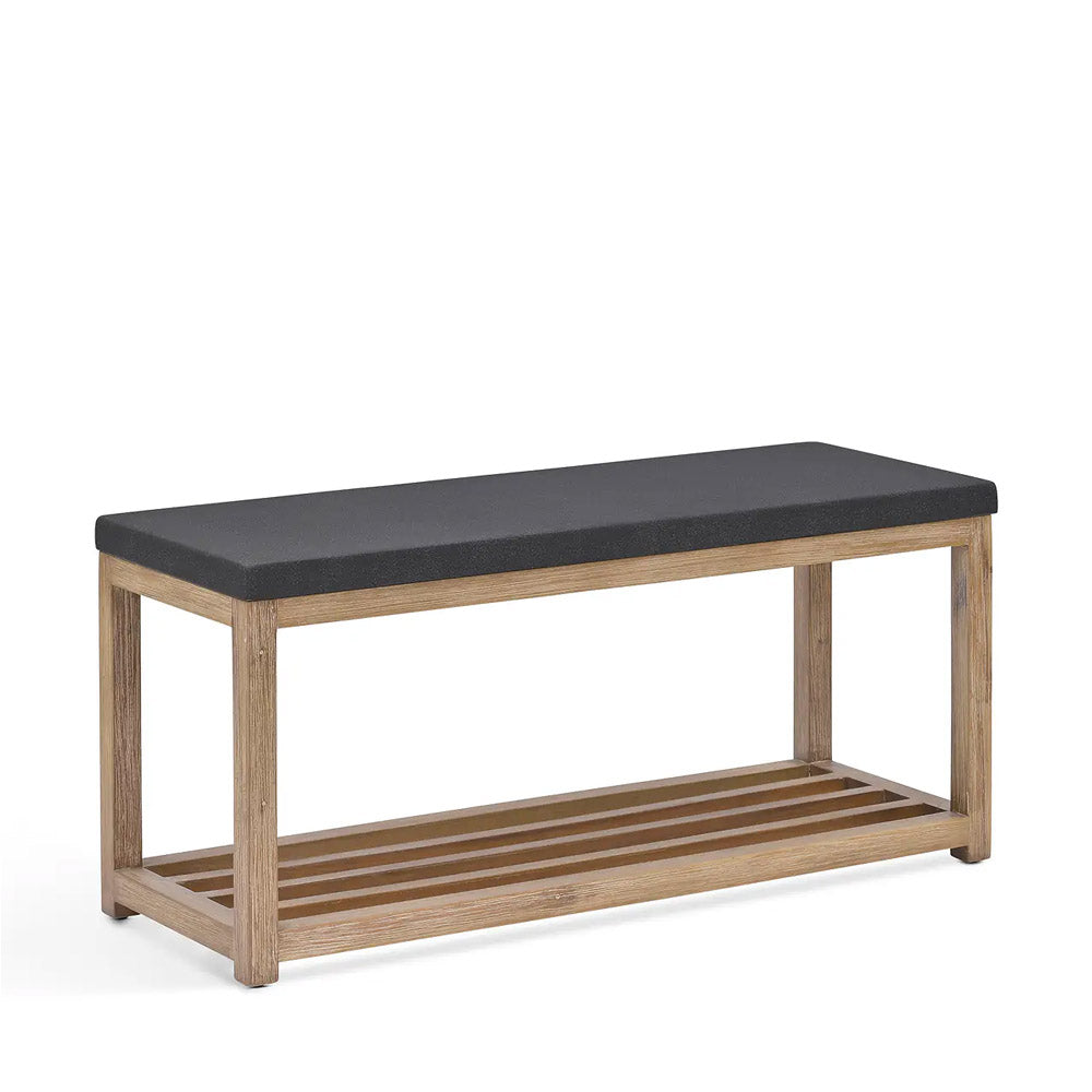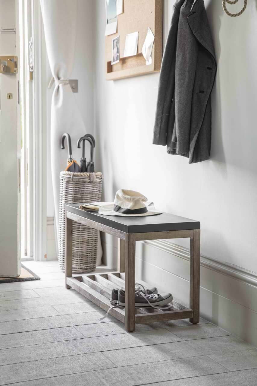 Supported by a sturdy angular base made from solid acacia wood, it features a stunning slate-style top for a lovely industrial aesthetic. A slatted lower shelf is ideal for neatly organising shoes, baskets, or other essentials, whilst maintaining its contemporary aesthetic.