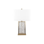 Blending subtle brutalist and art deco influences, it pairs bold textured glass with the gleam of brass-finished metal for a striking contrast. The standout feature is the glass base, which mimics the organic flow and texture of sculpted ice. A simple cream linen shade completes the piece, casting a warm, ambient glow.