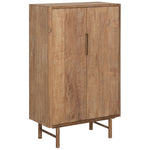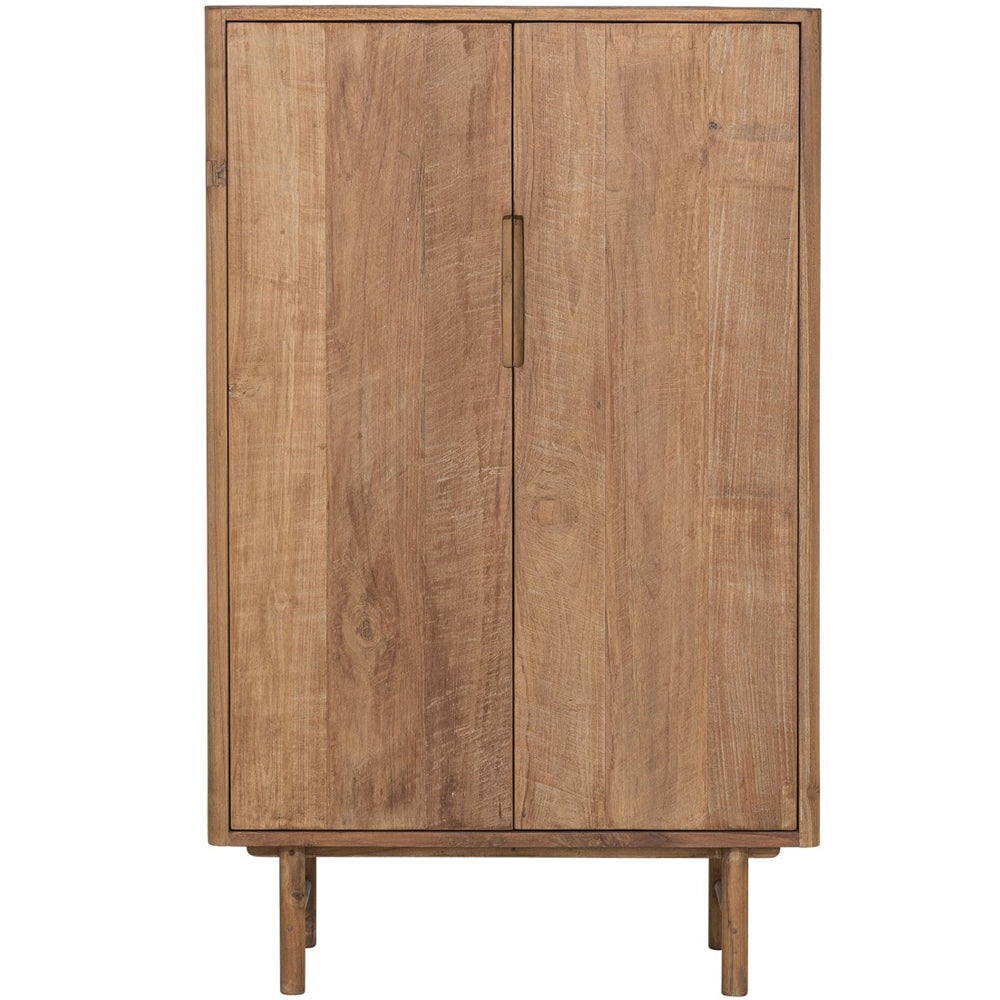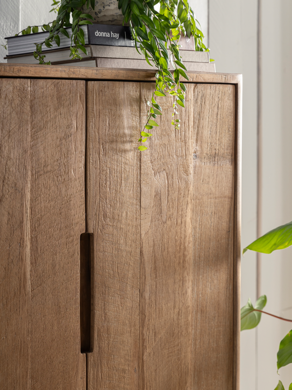 Crafted from recycled teakwood, it celebrates organic texture and one of a kind charm, with natural grain and variation that makes every piece feel unique. Its clean, contemporary silhouette sits on a raised frame, making it a natural fit for modern, rustic, or Scandi inspired interiors. Behind two doors, practical shelving keeps dinnerware, linens, board games, and everyday clutter neatly tucked away.