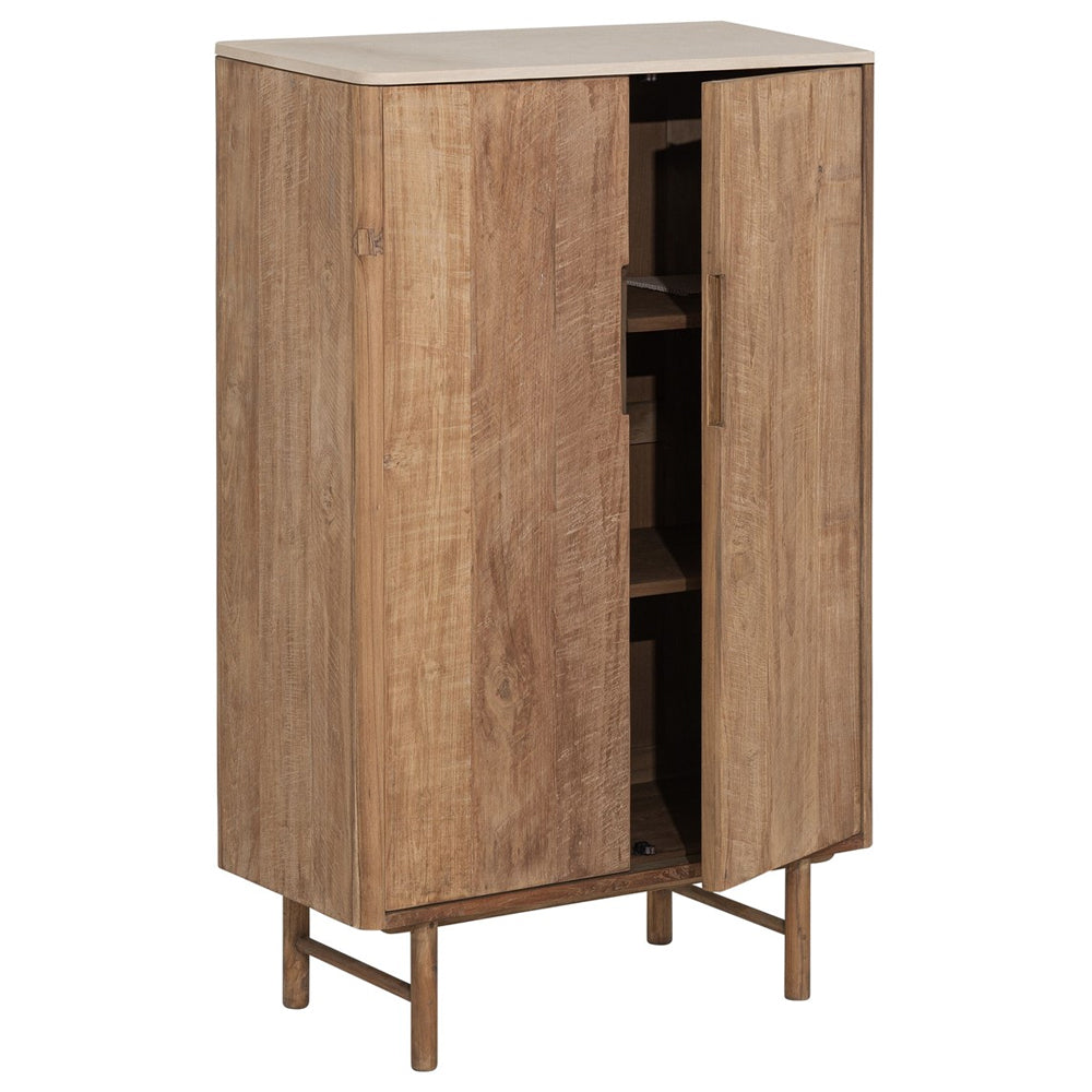 Crafted from recycled teakwood with a mortex top, it celebrates organic texture and one of a kind charm, with natural grain and variation that makes every piece feel unique. Its clean, contemporary silhouette sits on a raised frame, making it a natural fit for modern, rustic, or Scandi inspired interiors. Behind two doors, practical shelving keeps dinnerware, linens, board games, and everyday clutter neatly tucked away.