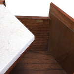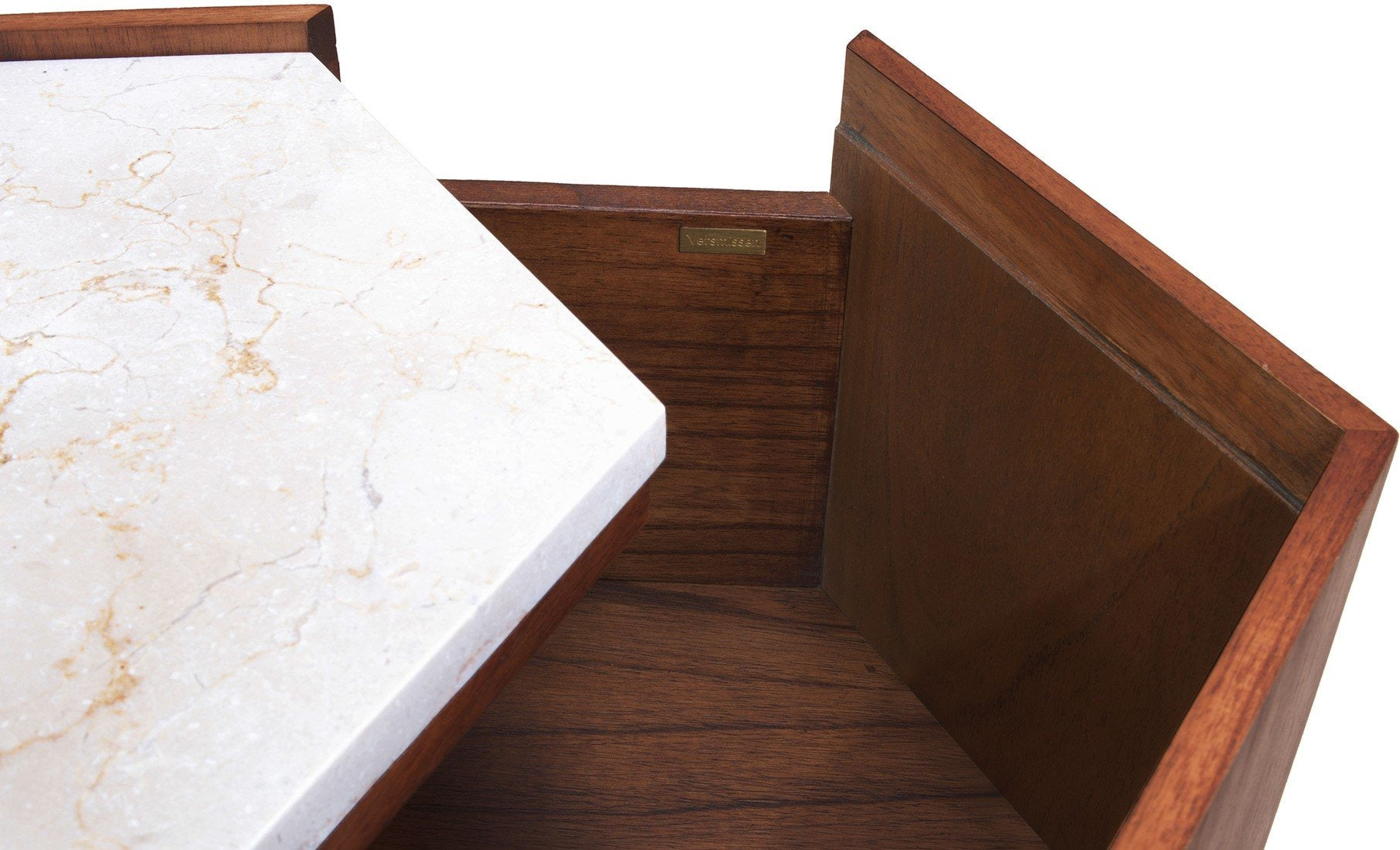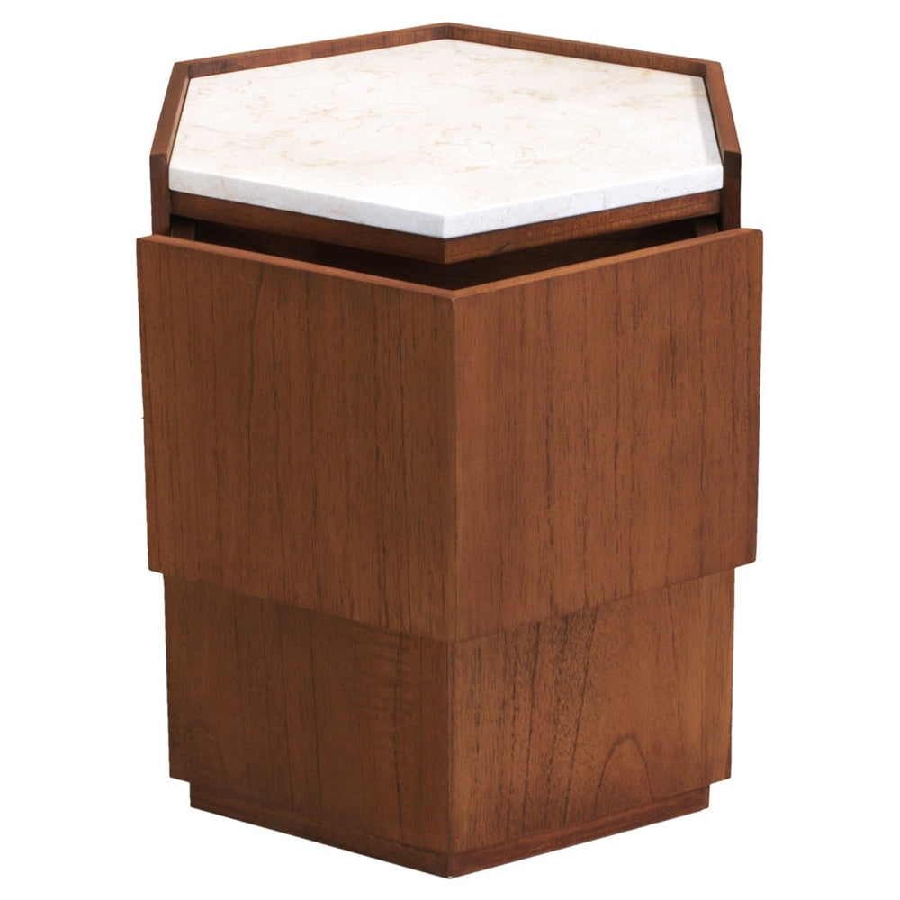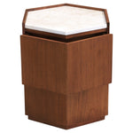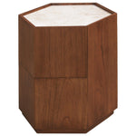 Expertly crafted from rich Mindi wood and mindi veneer, its hexagonal shape introduces bold geometric charm, while the warm finish highlights the natural grain. A smooth marble top adds a luxurious touch, offering the perfect surface for drinks, lighting or decorative objects. Hidden within the clean lines is discreet drawer space, providing practical storage without disrupting the sleek silhouette.