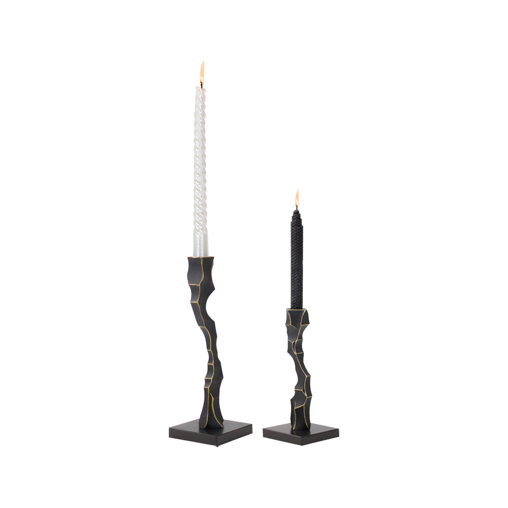 Resting on a solid square base of black marble, the piece exudes an understated elegance. This is offset by a resin holder flaunting a jagged aesthetic that evokes an edgy, modern vibe. The candlestick holder creates an unparalleled ambiance, further accentuated by your choice of candle colour and design. Enhance its impact by pairing it with its smaller counterpart for a captivating display.