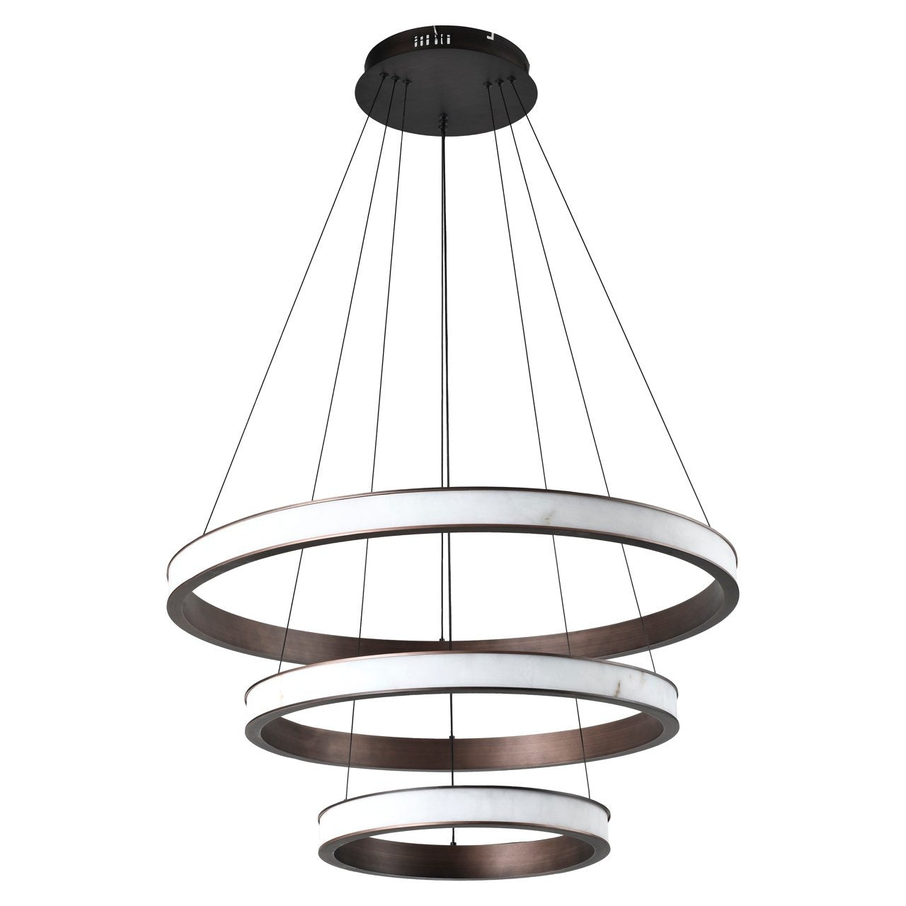 Three sleek, ring‑shaped LED strips crafted from iron and faux alabaster are suspended from slim wires, each ring graduating smaller than the last to create a tapered, celestial silhouette. The rings can be adjusted to suit your space, making it a striking focal point that draws the eye. Integrated LEDs shine through the faux alabaster, casting a warm, ambient glow that beautifully illuminates your room.