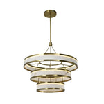 Featuring a bold, three-tiered concentric ring design, it pairs alabaster-effect diffusers with aged brass trim for a warm, ambient glow. The integrated LED strip casts soft illumination that highlights the chandelier’s layered structure, adding depth and sophistication. Its striking, architectural form makes it a perfect centrepiece for luxurious living rooms, formal dining spaces, or grand entryways.