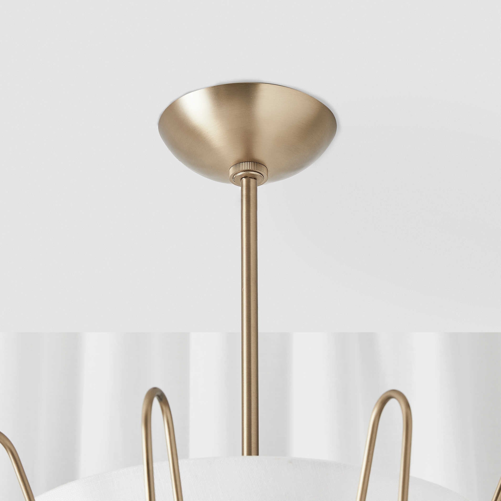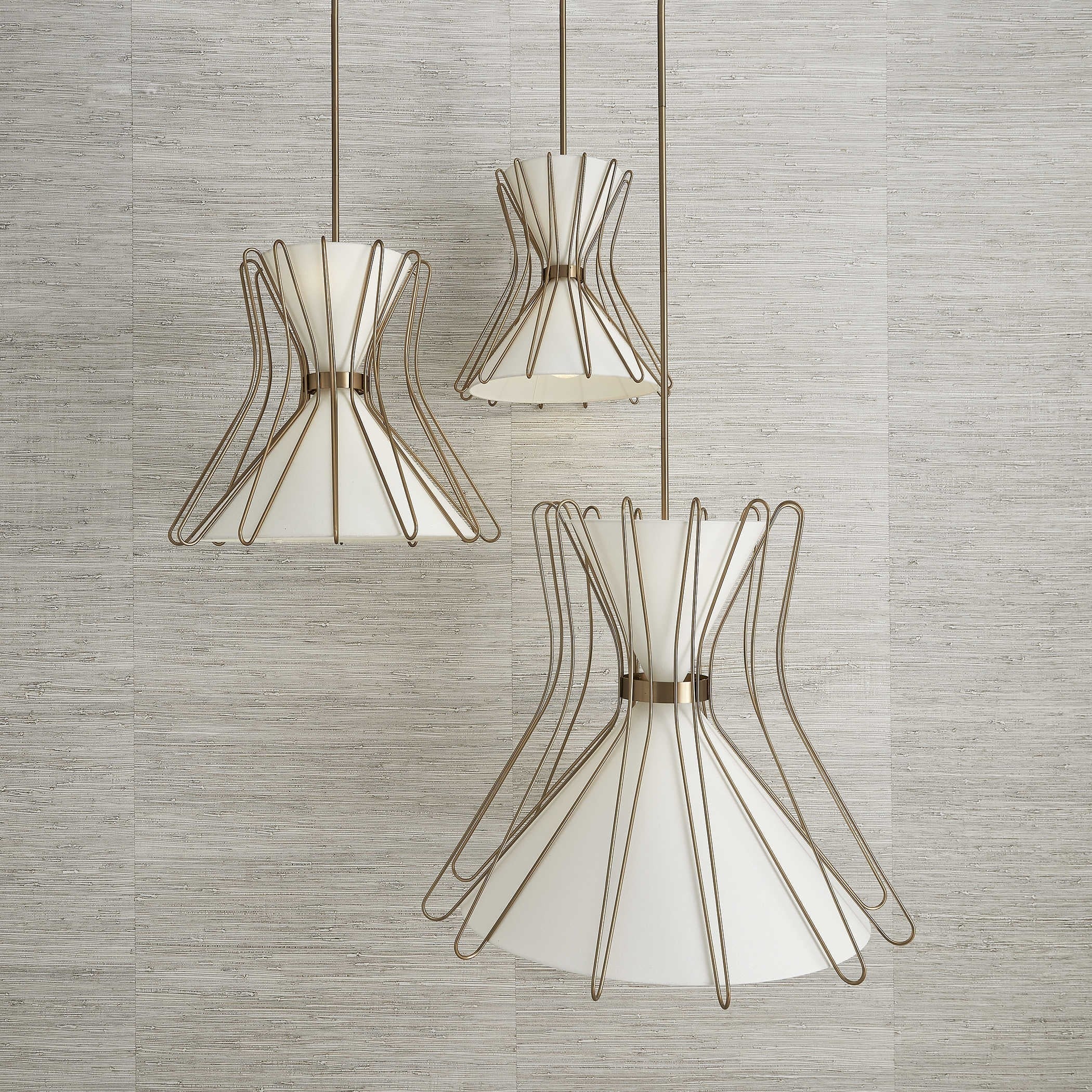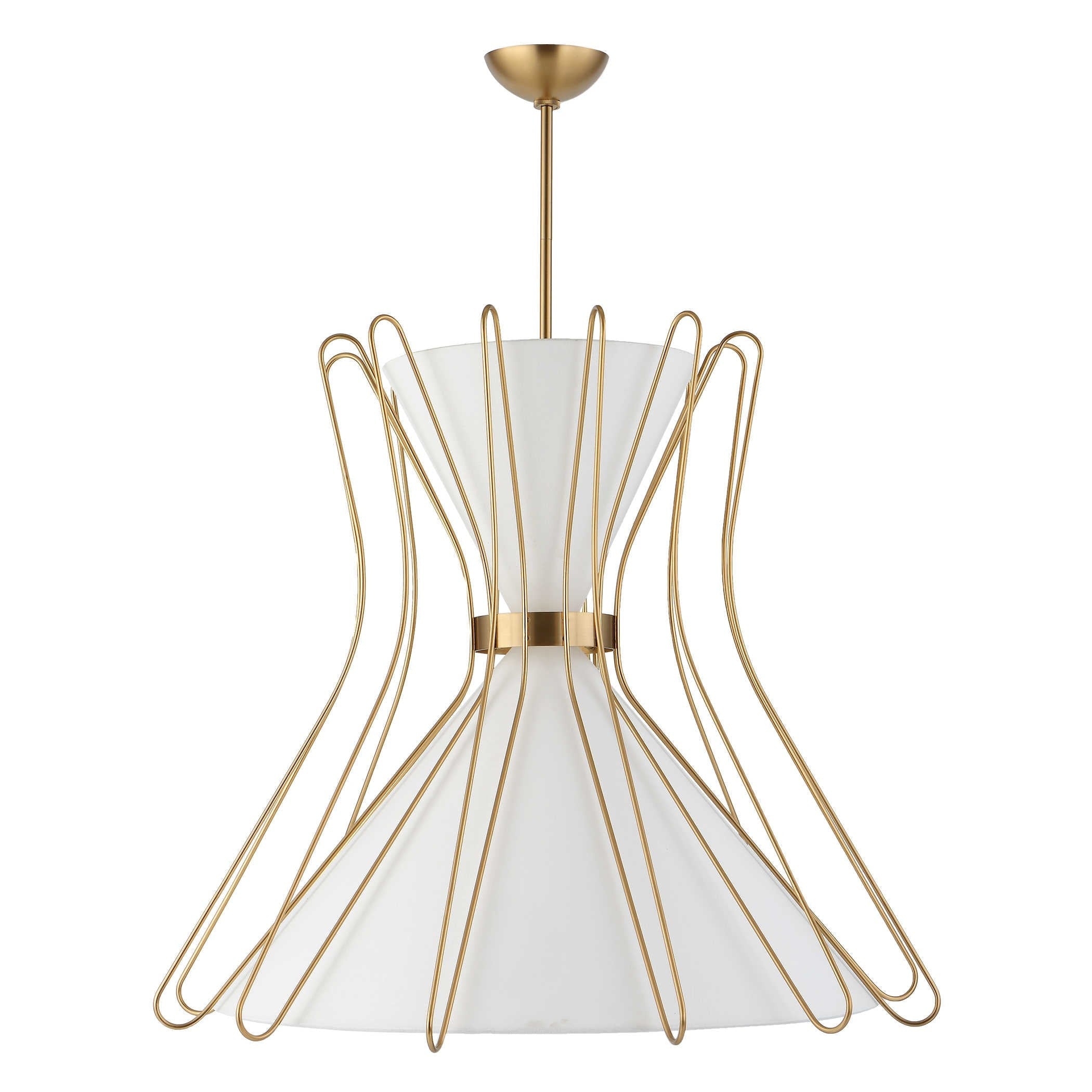 Featuring a sculptural hourglass silhouette, this striking piece combines a soft linen shade with elegantly curved brass-finished metalwork, offering a modern take on mid-century style. four bulbs – one in the bottom cone and three in the top – create a warm, multidirectional glow that enhances both ambience and function.