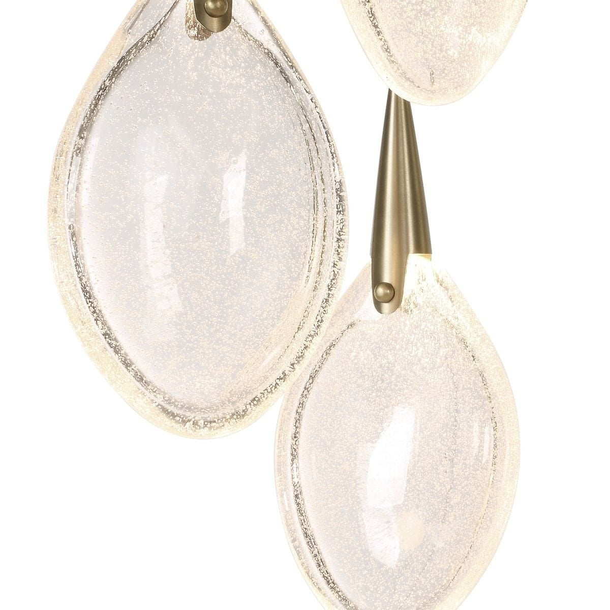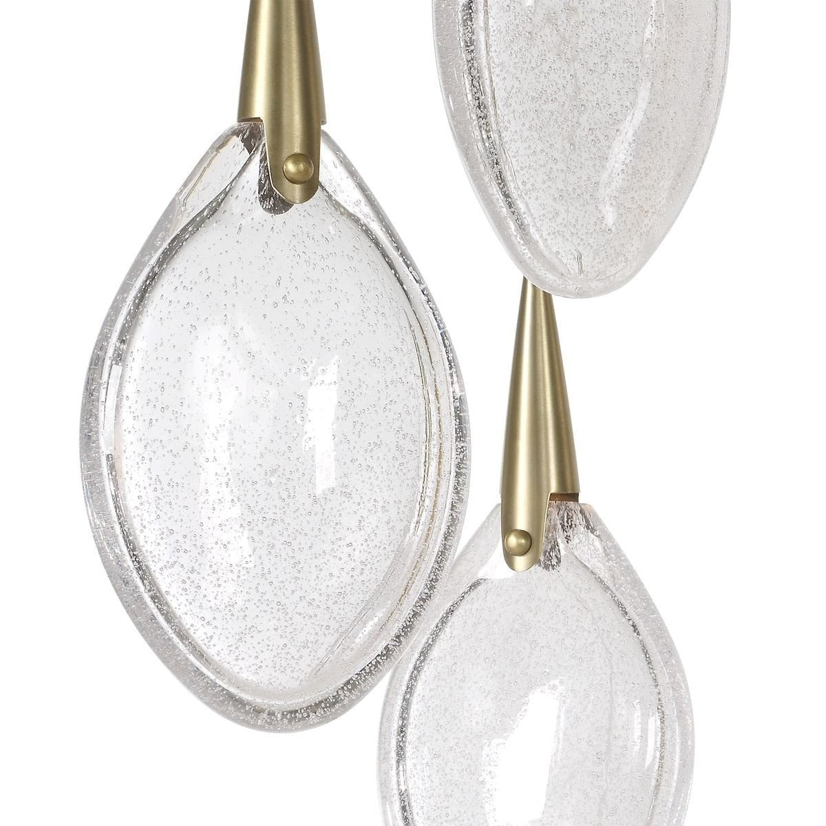 Featuring seven teardrop-shaped bubble glass pendants suspended at varying heights from a sleek brass-finished ceiling rose, it offers a sense of depth and movement. Each droplet is illuminated by integrated LED lighting, casting a soft, shimmering glow. Adjustable wires allow for a customised arrangement, making it suitable for both low and high ceilings.