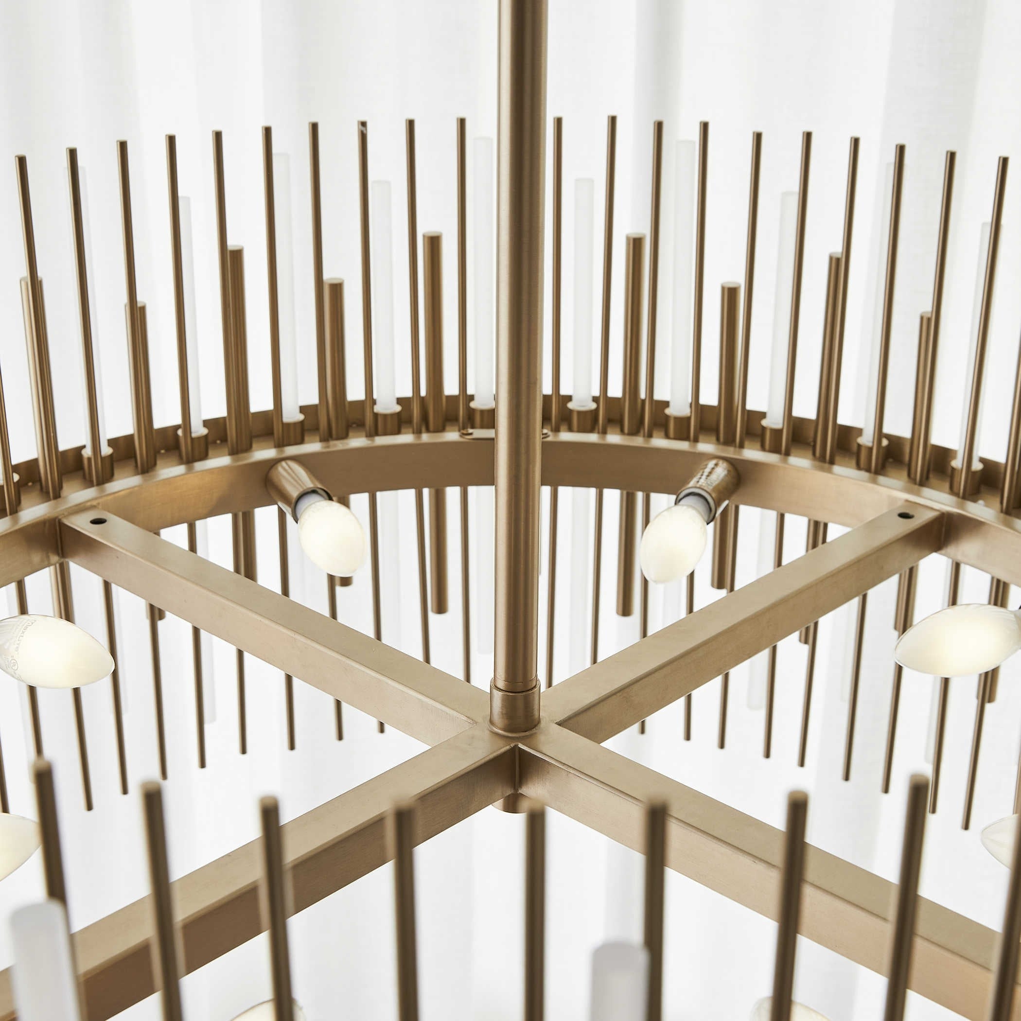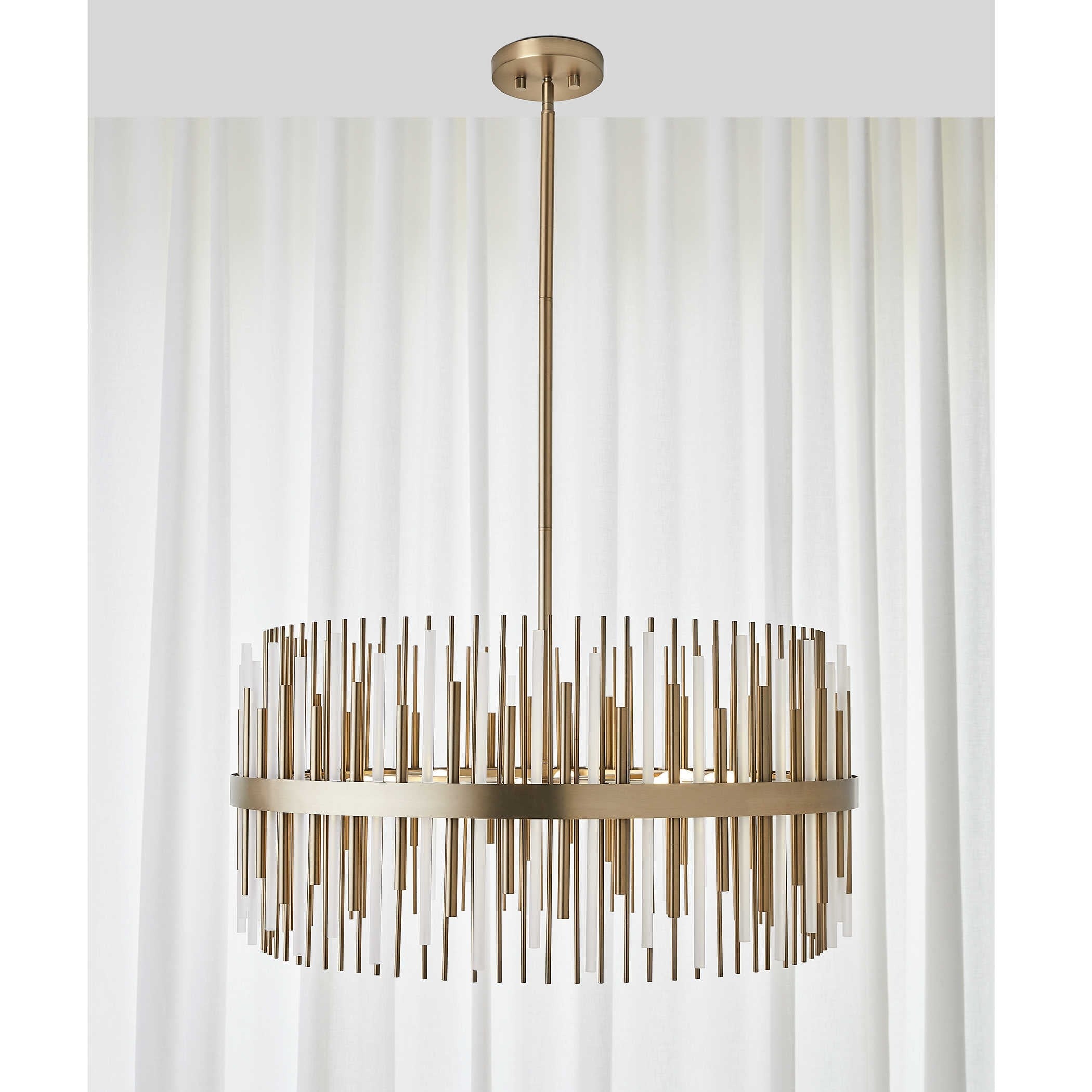 Suspended from a slim stem, a circular brass-finished band supports a striking arrangement of metal and frosted acrylic rods, layered in a rhythmic composition. This dynamic design creates a captivating interplay of light, texture, and shadow, adding a sense of movement and drama. Delivering both an ambient glow and bold visual impact, it's ideal for interiors that embrace standout design.
