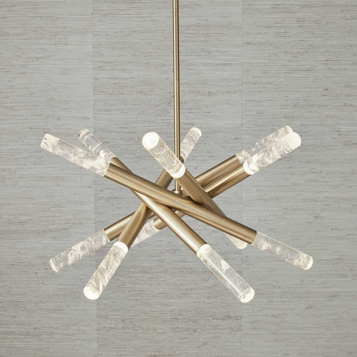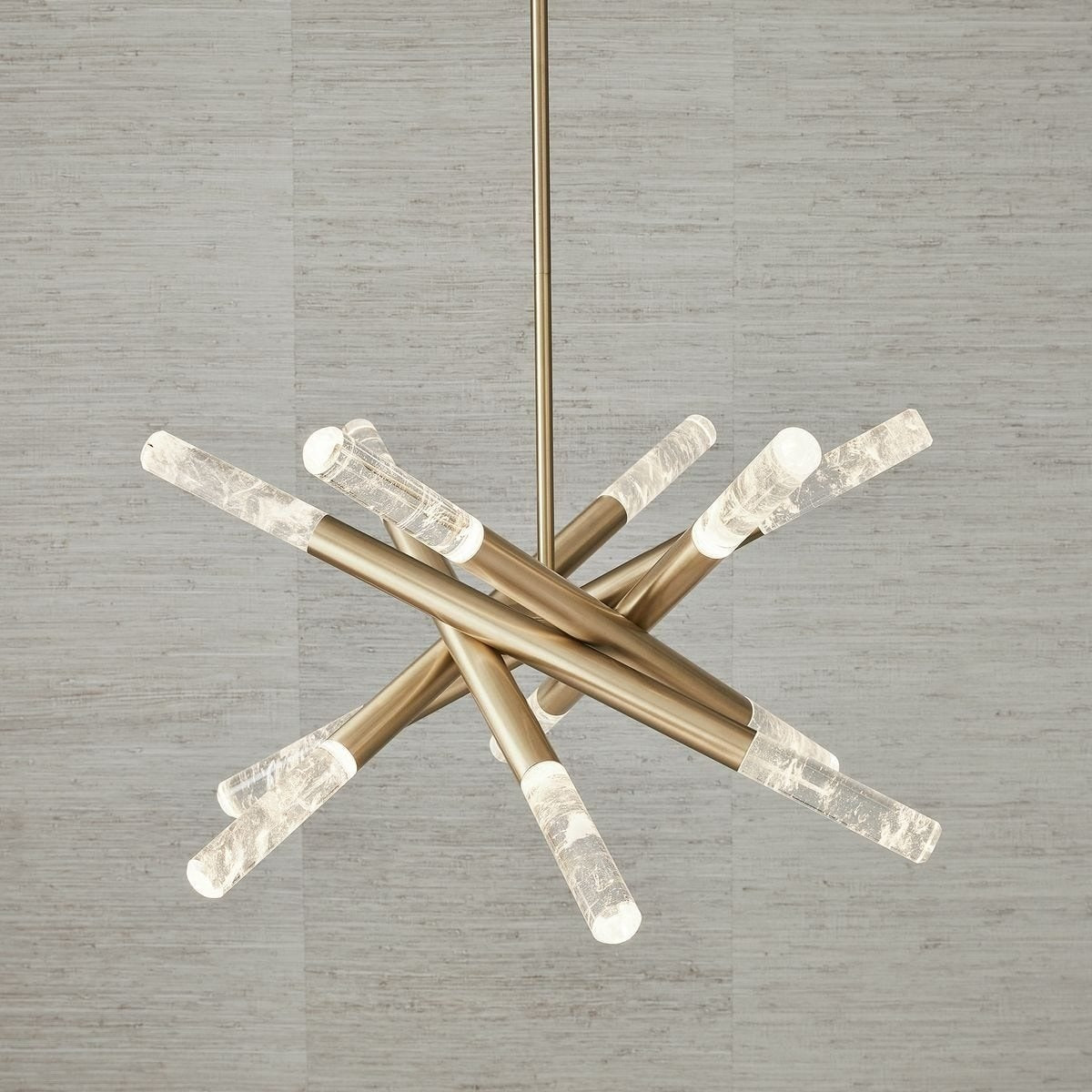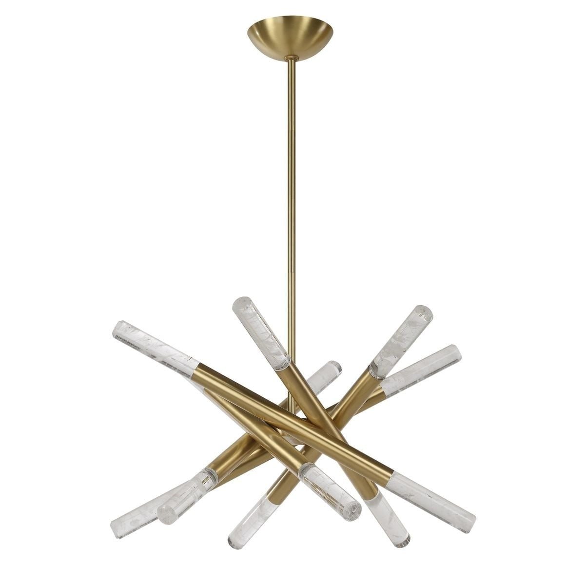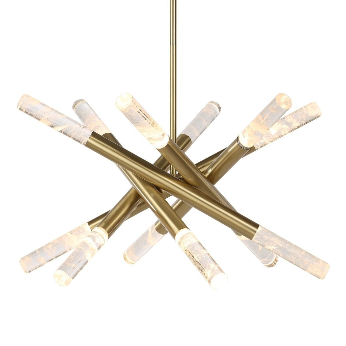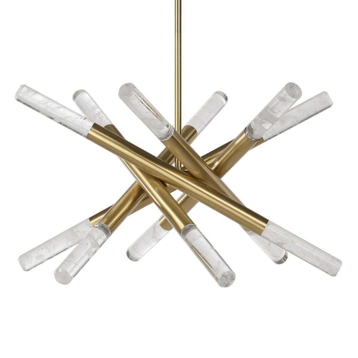 Six intersecting batons in a warm brass finish create a dynamic starburst, each tipped with manmade quartz crystal for a refined, contemporary touch. Integrated LED lighting within the crystal ends emits a radiant glow, accentuating the veining and texture for added visual depth. Suspended from a matching rod, this pendant combines artistic form with functional illumination.