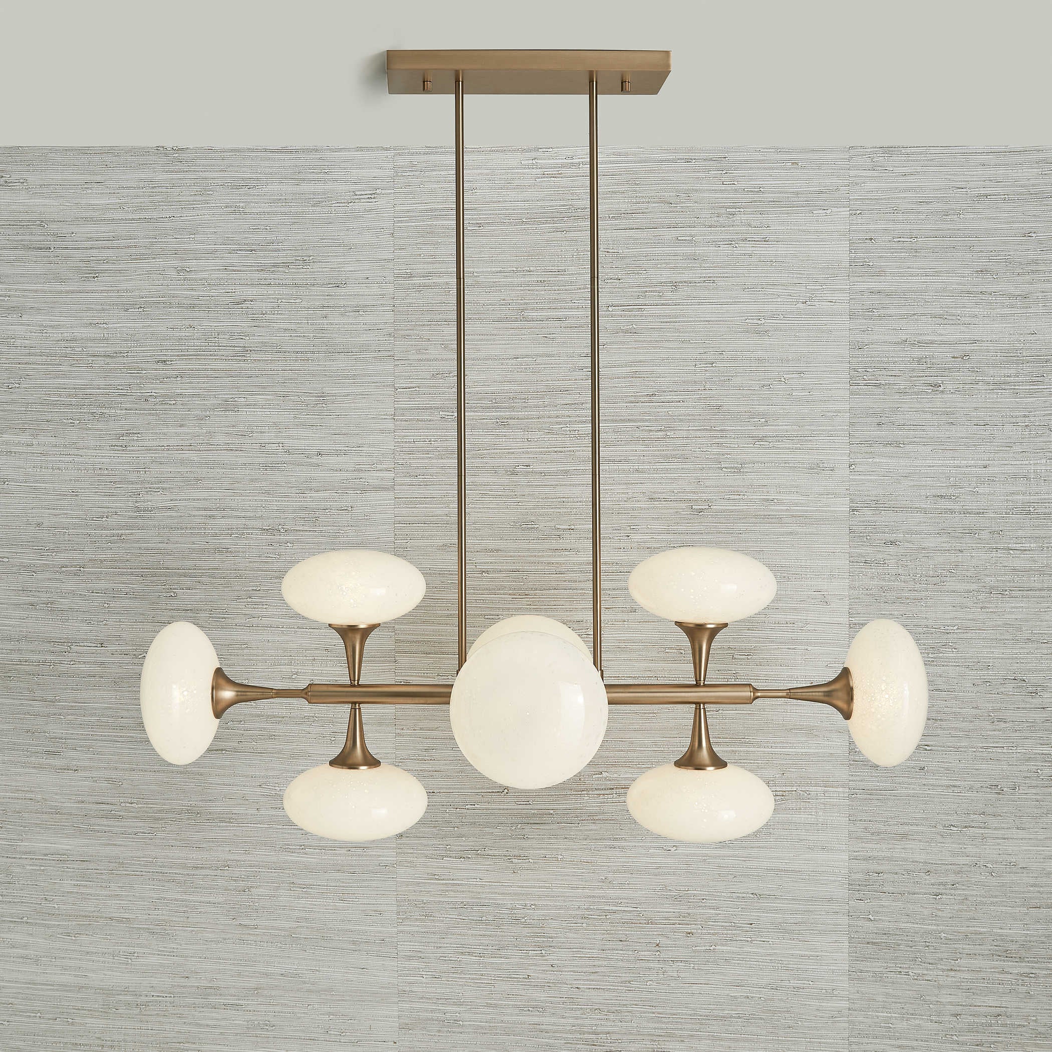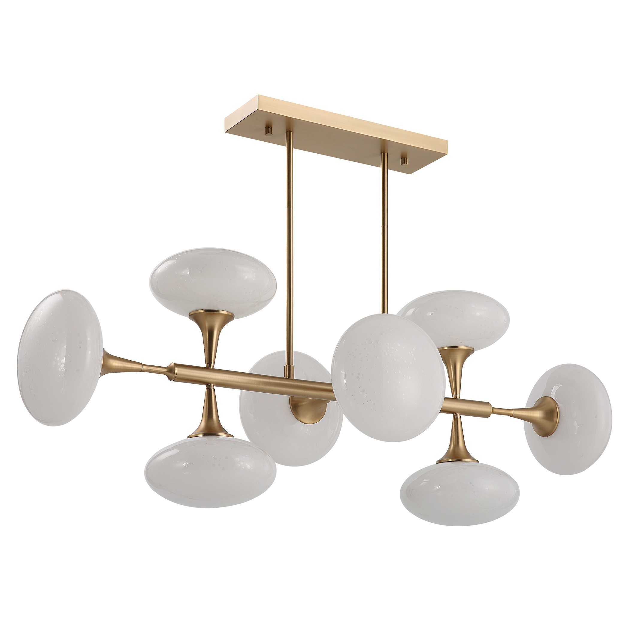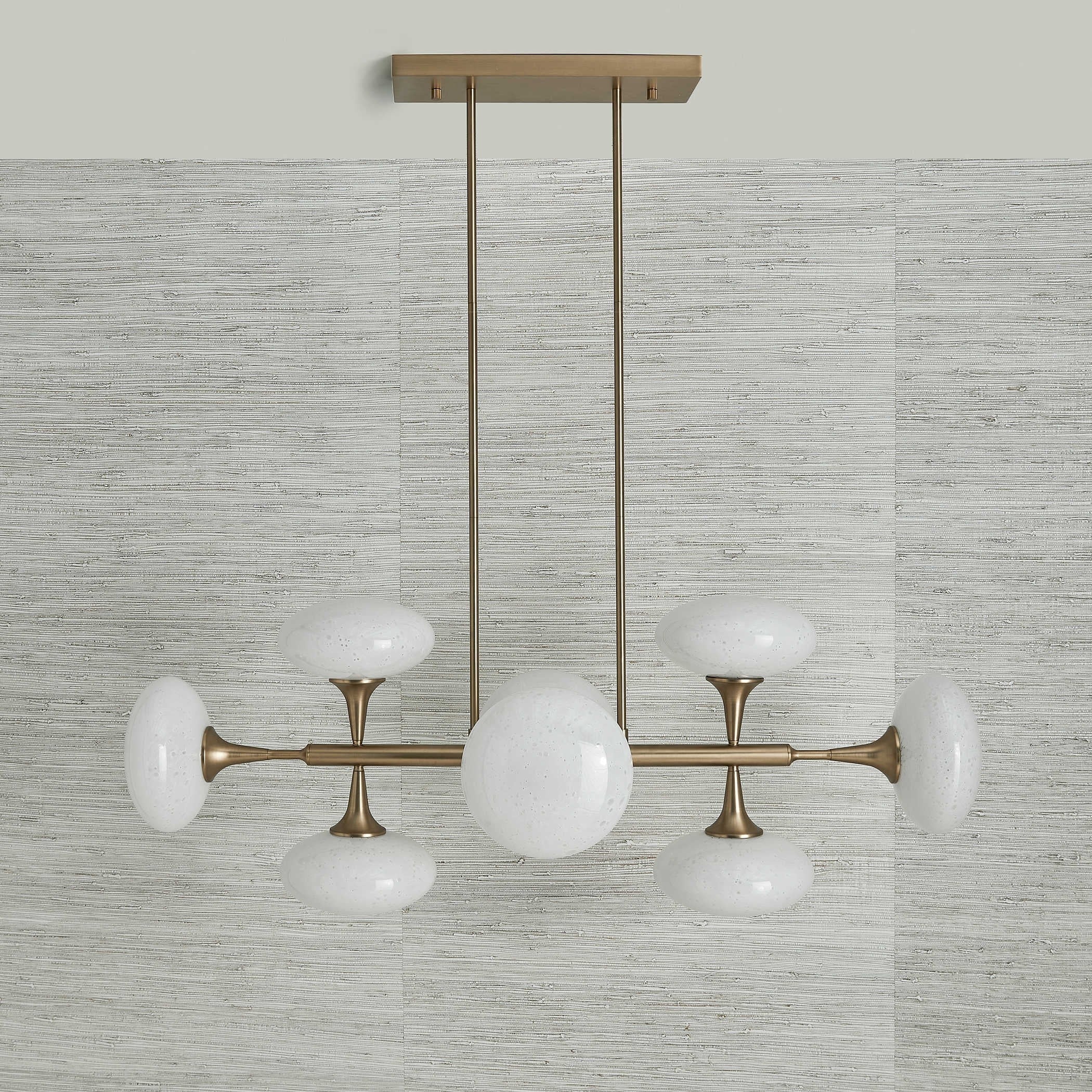 With brass metalwork and smooth white glass shades, it offers a sleek contrast that complements contemporary or mid‑century inspired interiors. The satellite‑like arms create a dynamic silhouette, making it a standout feature above dining tables, kitchen islands or in open‑plan spaces. Adjustable rods allow you to tailor the drop to suit your room perfectly.