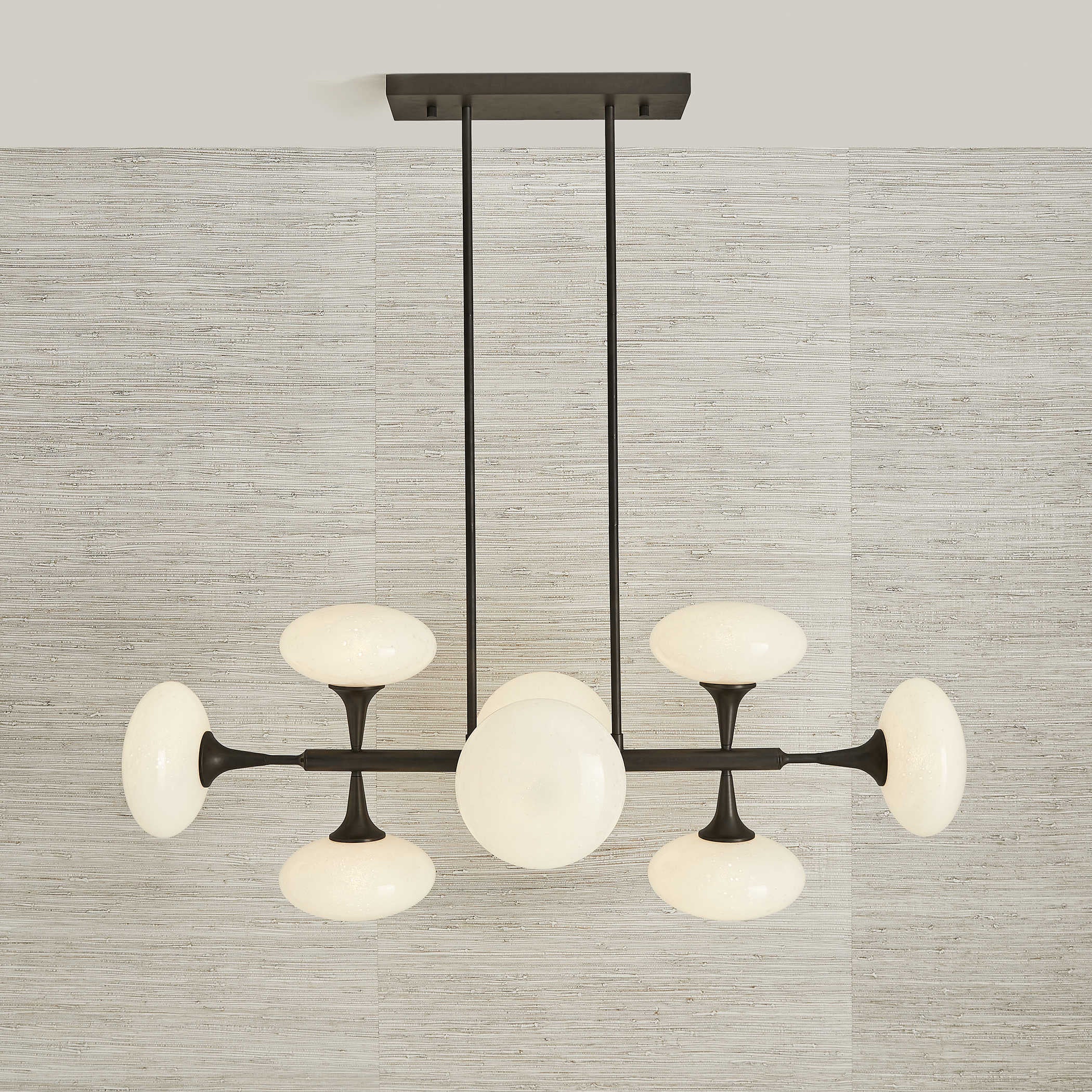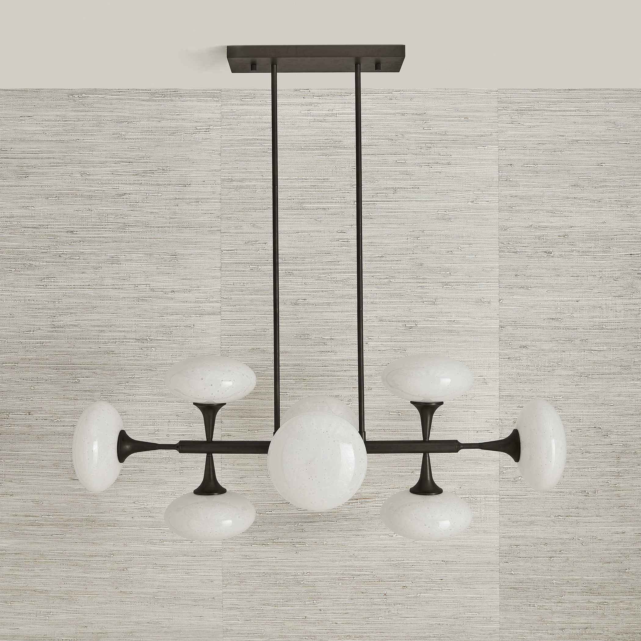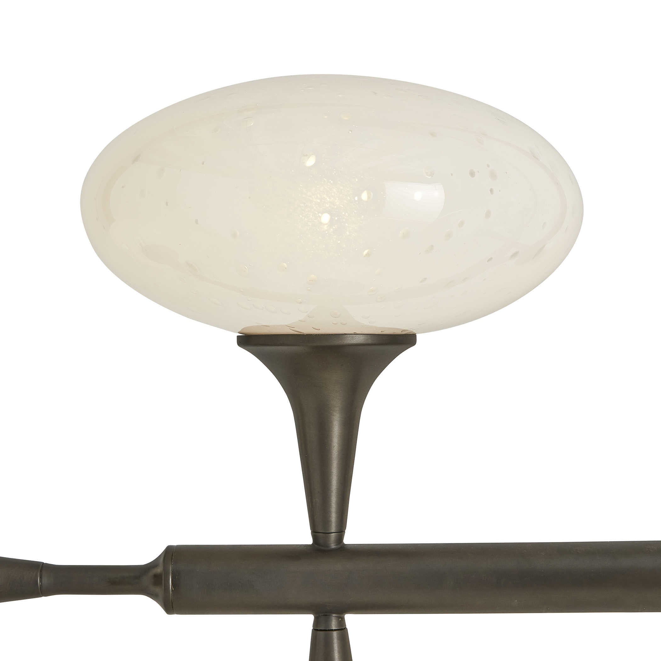 With dark bronze metalwork and smooth white glass shades, it offers a sleek contrast that complements contemporary or mid‑century inspired interiors. The satellite‑like arms create a dynamic silhouette, making it a standout feature above dining tables, kitchen islands or in open‑plan spaces. Adjustable rods allow you to tailor the drop to suit your room perfectly.