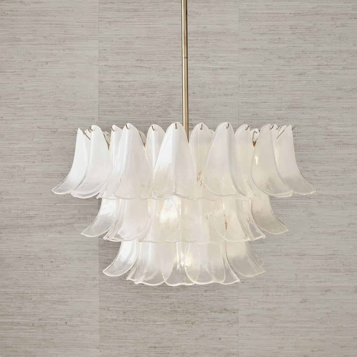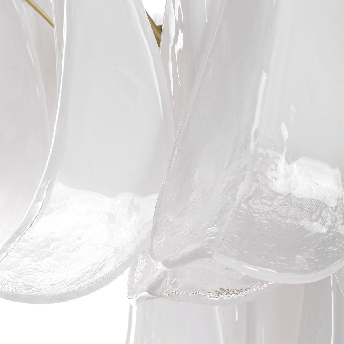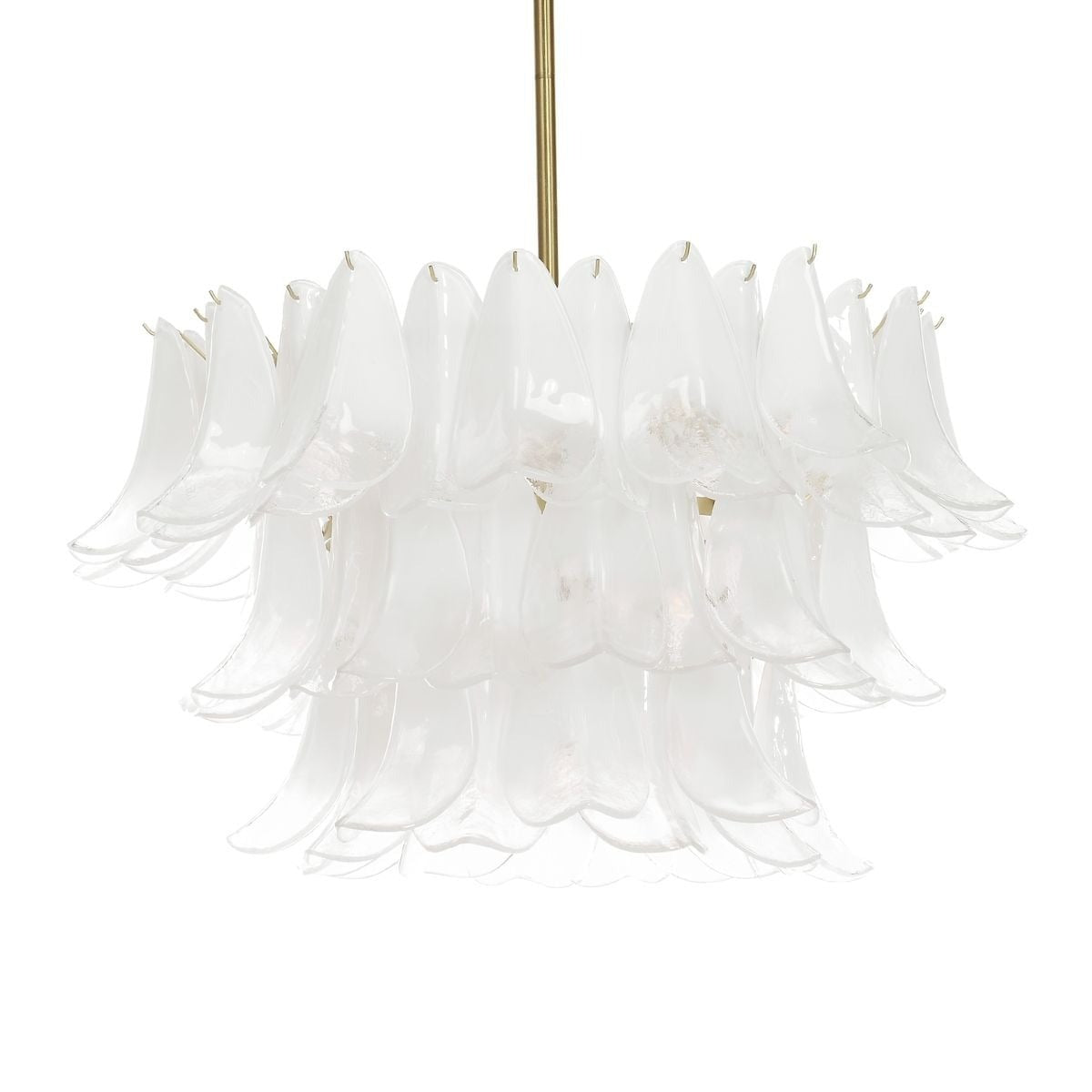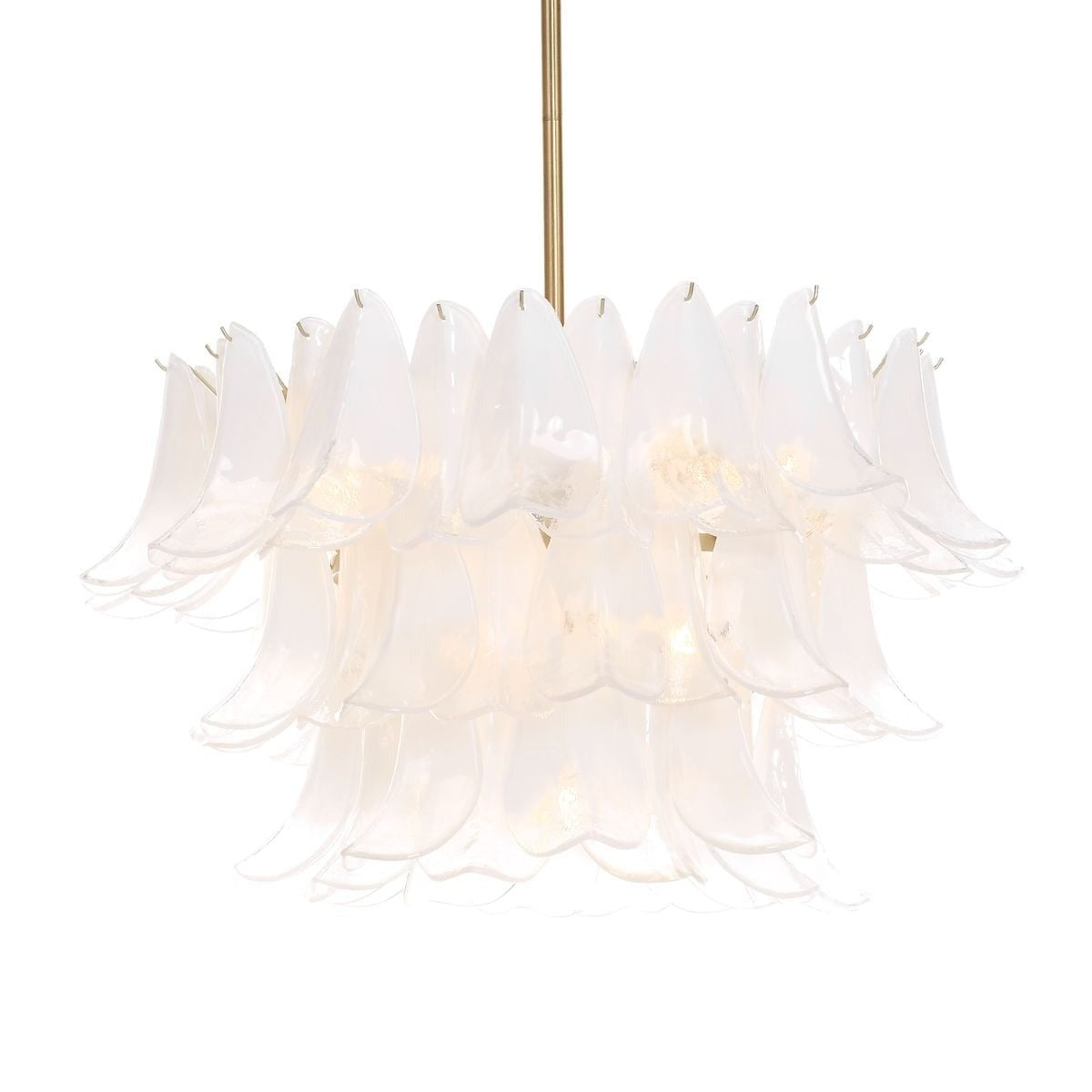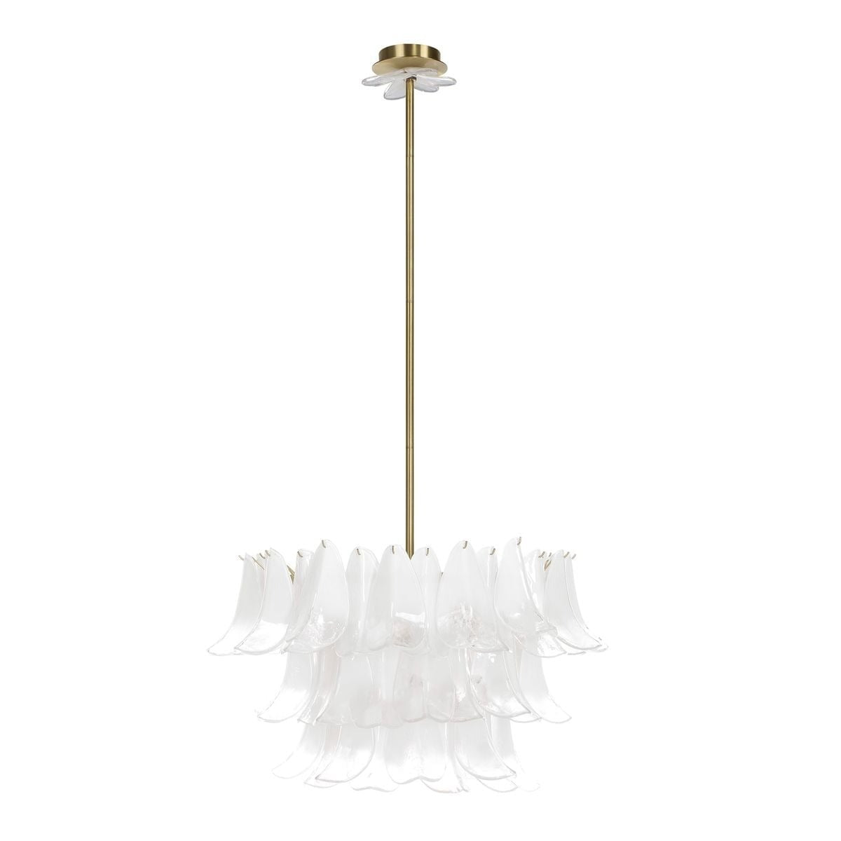Its tiered, sculptural design features layers of ombré white glass petals that gently diffuse light, casting a soft, ambient glow. Brass-finished metalwork adds a warm contrast, bringing a touch of modern sophistication to the organic form. Even the ceiling rose is thoughtfully detailed with matching glass accents, ensuring beauty from every angle.