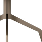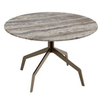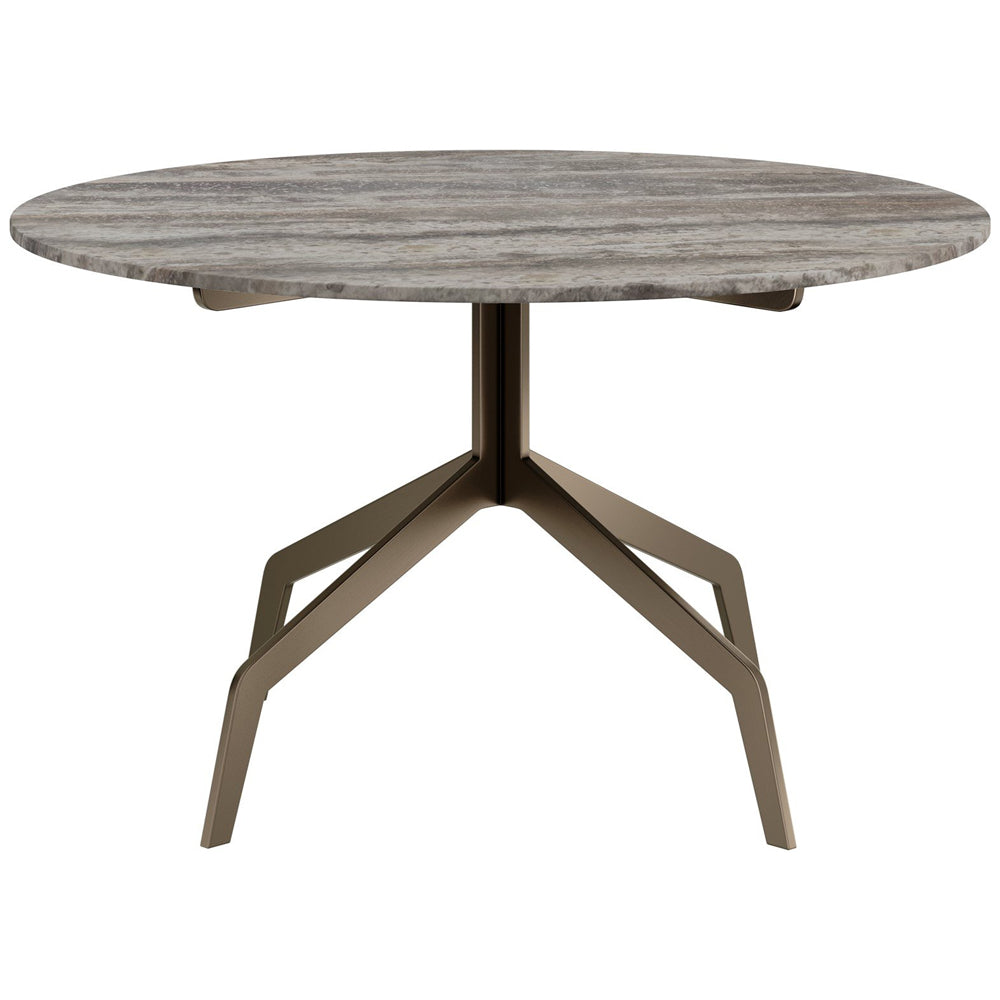 Its grey travertine top highlights the organic beauty of the stone, exuding timeless charm and a refined, earthy allure. Supporting this stunning surface is a sleek, angular spider-leg base in brushed bronze, offering a contemporary, industrial touch. The juxtaposition of materials and clean lines creates a striking yet airy aesthetic that fits effortlessly into modern spaces.