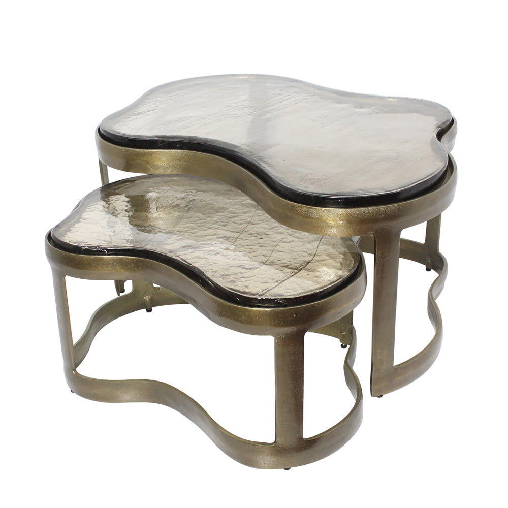 This striking set of two features a nesting design, perfect for versatile styling in both compact and open-plan spaces. Each table showcases an antique brass-finished aluminium frame, gracefully curved to echo the organic form of the cast glass tops. The textured glass surface adds depth and light play, making each piece uniquely captivating.
