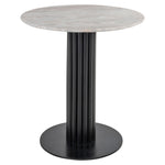 Its fluted pillar base is a standout feature, crafted from recycled wood and iron for lasting stability, while the dark finish adds a refined touch. The round top is made from beige Toronto marble, offering a natural aesthetic with unique veining that makes each piece truly one of a kind.