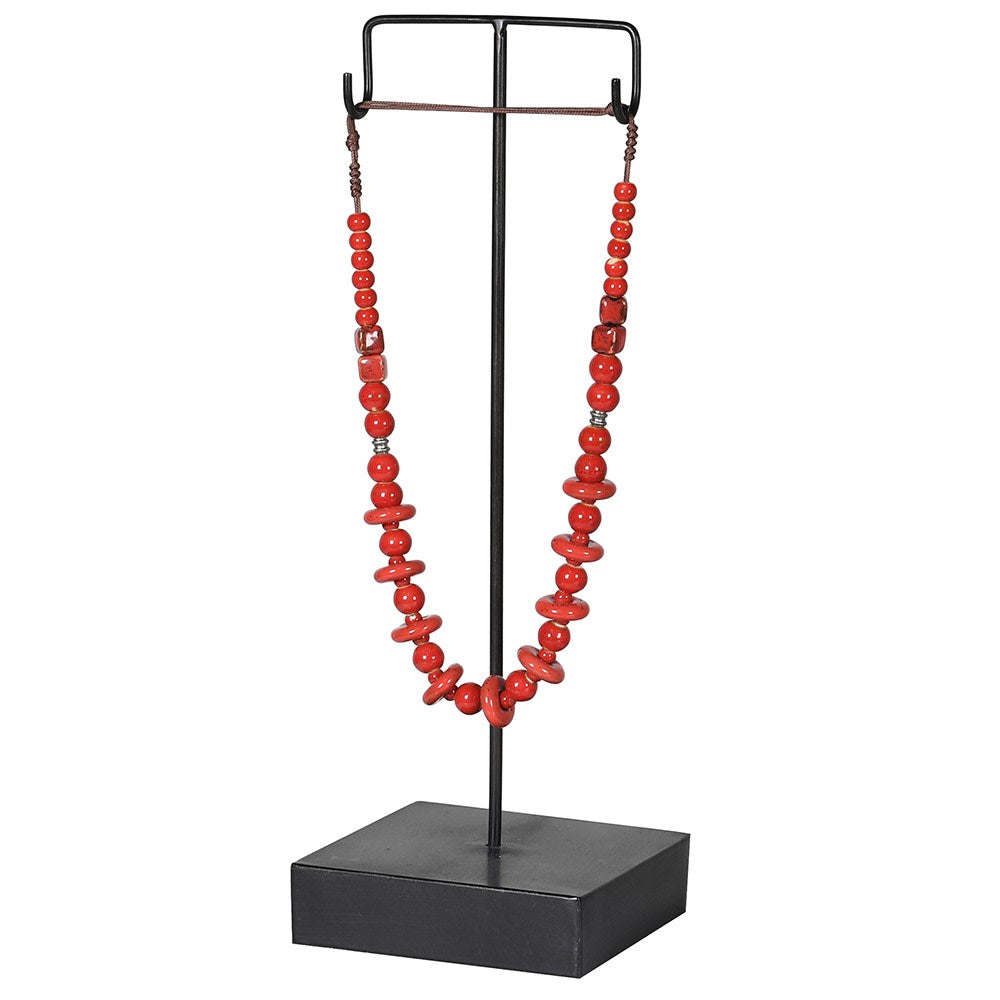 Beautifully presented on a black iron stand, our crimson beaded necklace stands out as an effective statement piece in any room of the house. Featuring a series of vibrant red beads in varying shapes and sizes, it possesses an almost tribal quality that is guaranteed to spark interest. Pride of place on a shelf or console, it creates a striking vision to uplift your space with ease.