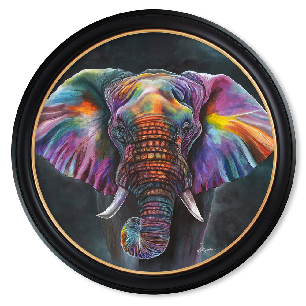 With a distinctive technicolour style, it captures the strength and spirit of a majestic elephant through expressive and intricate detail. Presented in a classic black frame with a gold inner trim, it balances contemporary flair with timeless style.