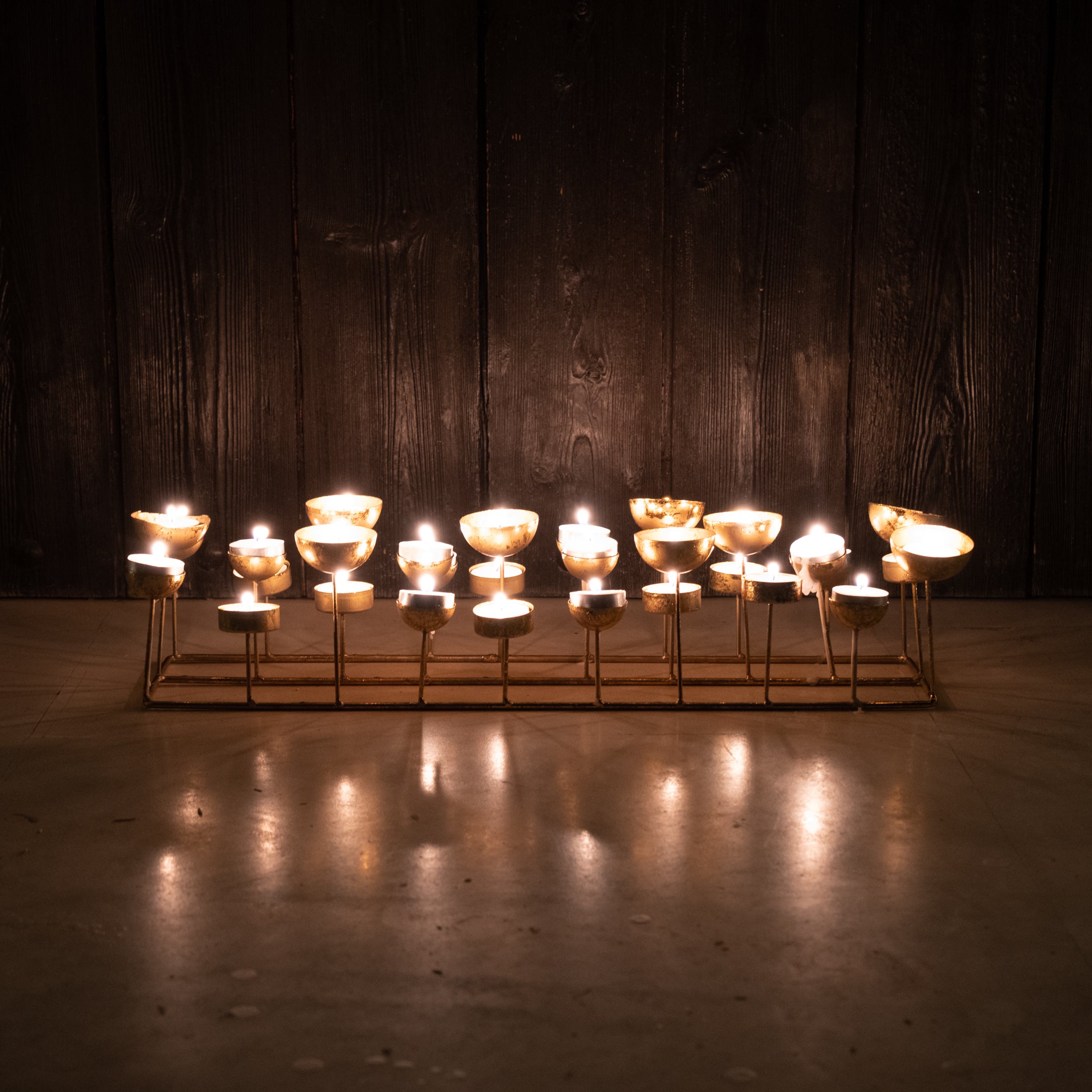 Inspired by Thomas Heatherwick's famous and beautiful London 2012 Olympic Cauldron, this large beautiful gold tea light holder features 30 tea light holders of varying heights and sizes for an elegant and arty effect. Looks simply stunning at night when containing lit tea lights.