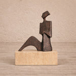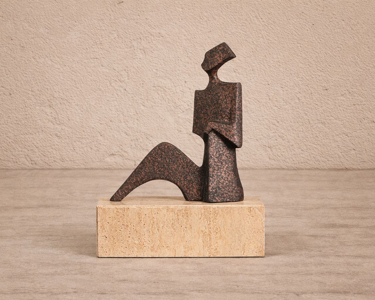 Cast in aluminium with a speckled black bronze effect, the figure’s angular, minimalist form reflects modernist influences while maintaining timeless appeal. Resting atop a warm marble base, it’s beautifully grounded by natural contrast and elegance.