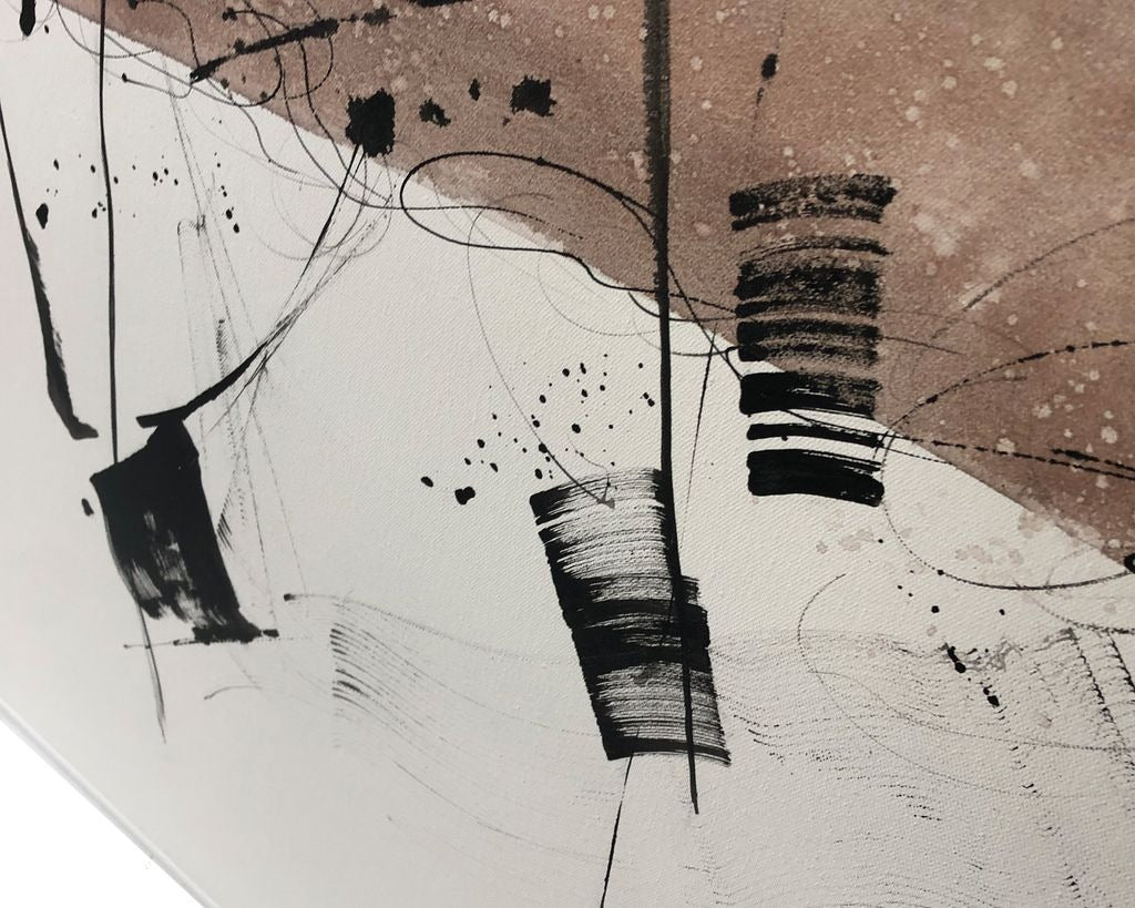 This captivating abstract artwork blends soft blush tones with bold black brushstrokes to create a fluid, expressive aesthetic. Presented in a white oak frame, it suits modern and minimalist spaces, adding a refined touch of artistic flair without overwhelming the room. With its hand‑finished detail, the piece offers a sense of depth and rhythm that naturally draws the eye.