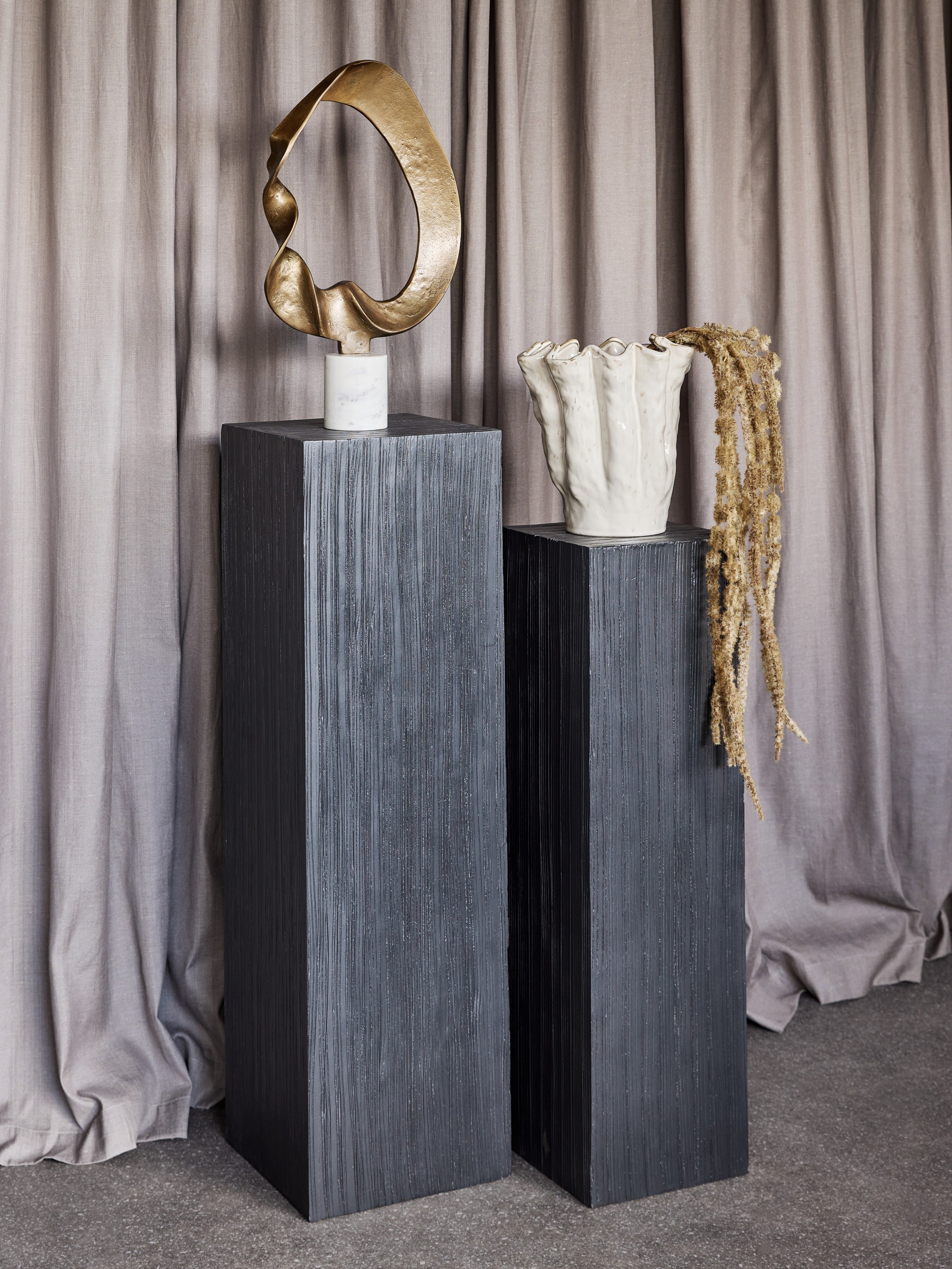 This striking set of two features grooved wood in a rich matte black finish, combining depth and texture for a gallery-inspired aesthetic. Designed to elevate vases, sculptures, or floral arrangements, each plinth provides a sleek, understated platform that lets your statement pieces take centre stage.