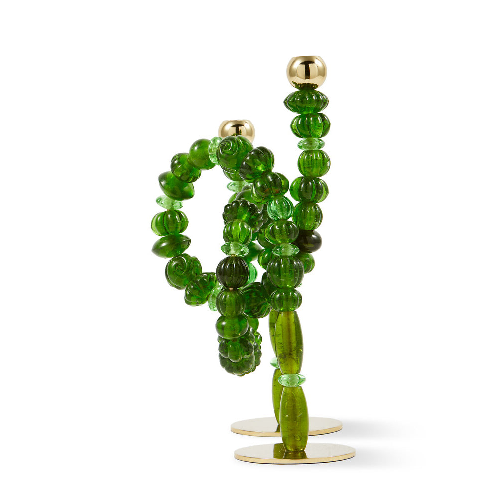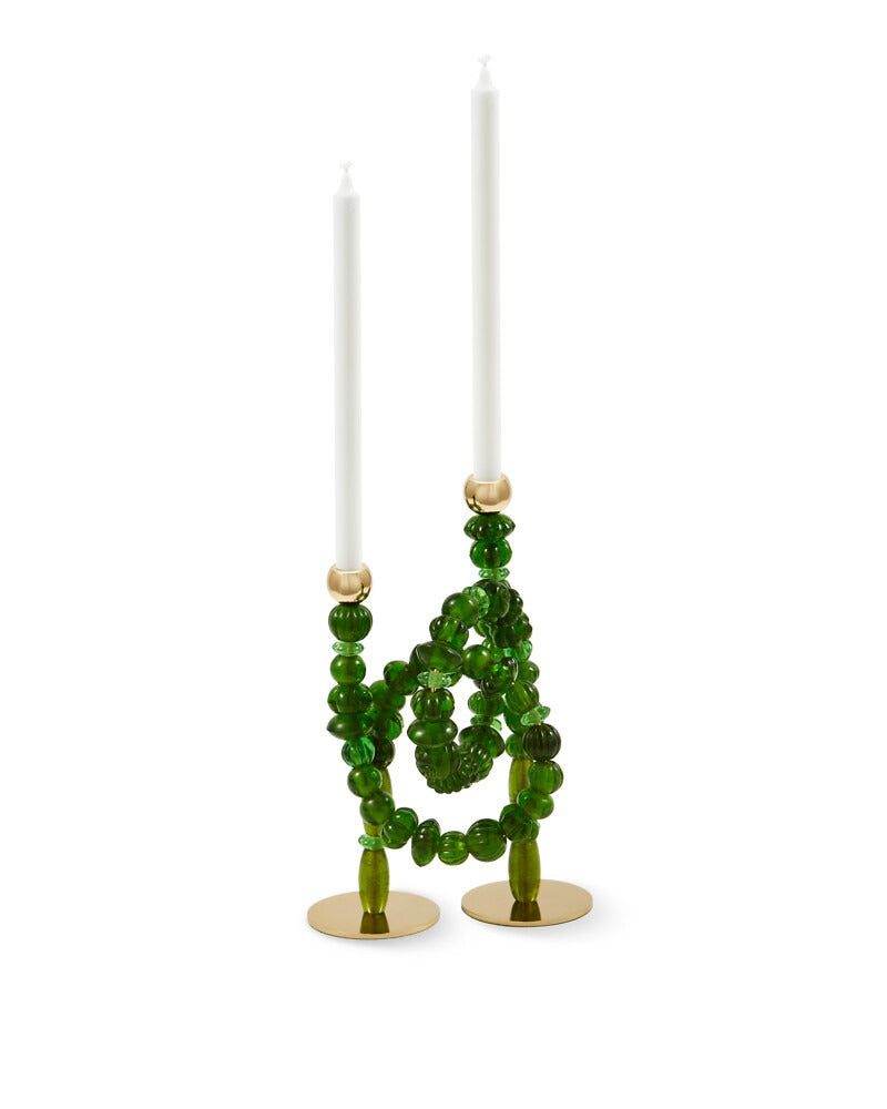 Handmade with meticulous attention to detail, this candle holder features a stainless steel and aluminium metal frame adorned with recycled green glass beads. The intricate beadwork adds a playful yet sophisticated touch, making it a captivating centrepiece for any dining table, mantel, or living space.