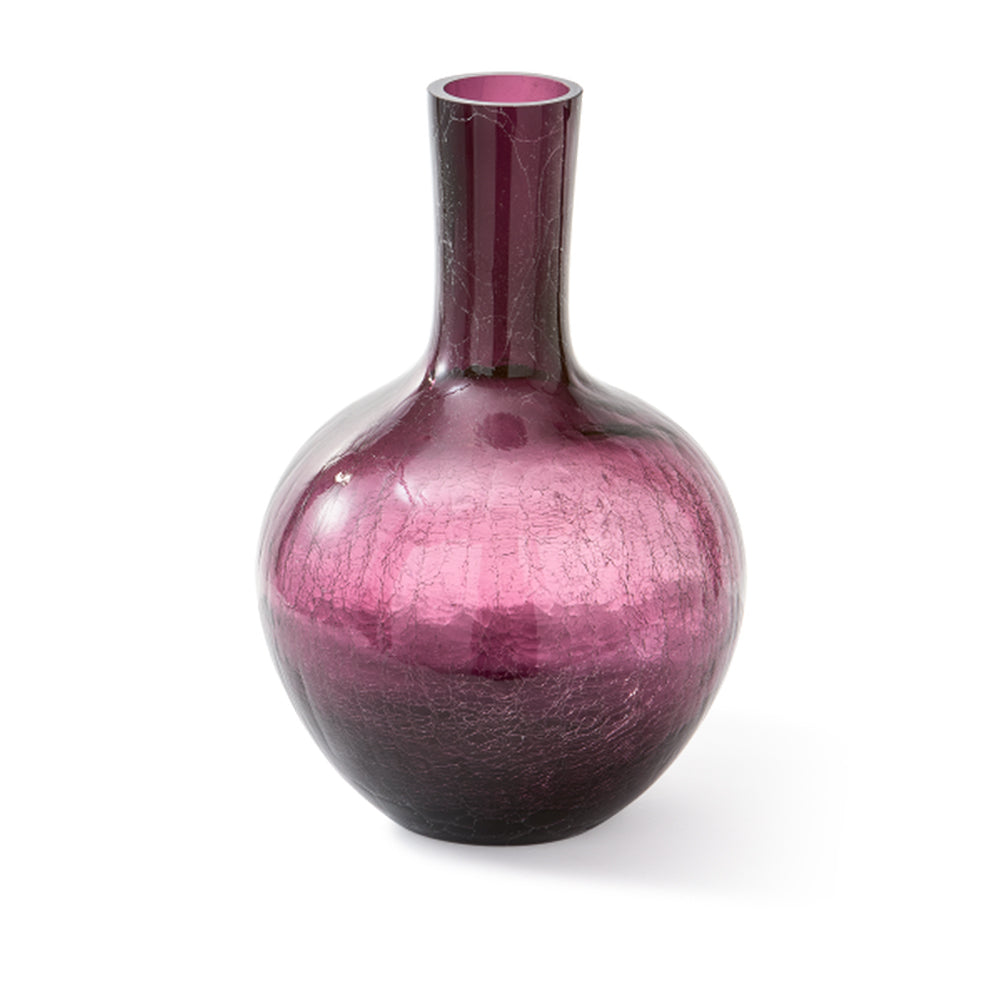 Expertly mouth-blown from sumptuous purple glass, each piece undergoes a unique ice-dipping process before baking to create the captivating crackled finish that allows it to stand out from the crowd. Hand-made and unique, these subtle fractures do not compromise the vase's robustness, promising a long-lasting addition to your space.