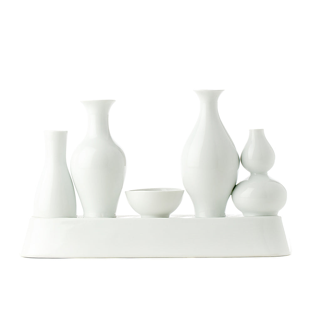Designed by Norman Trapman, this unique vase is crafted in smooth white porcelain, and fuses individual shapes into a multifaceted silhouette, all perched atop a sleek base. The result is a striking, unified piece that serves as a canvas for awe-inspiring floral arrangements.