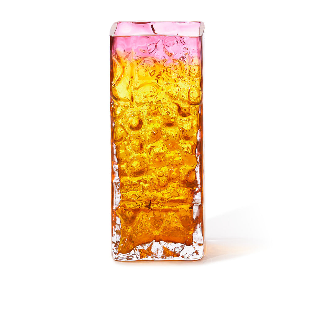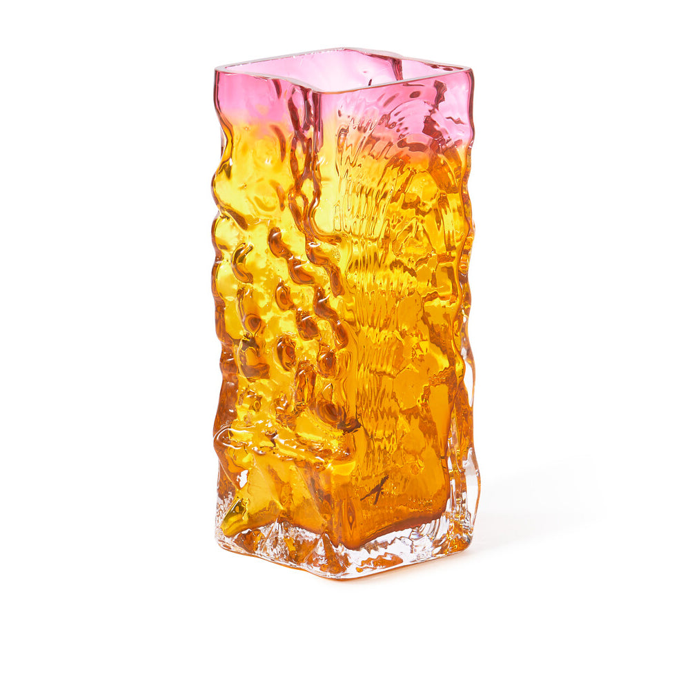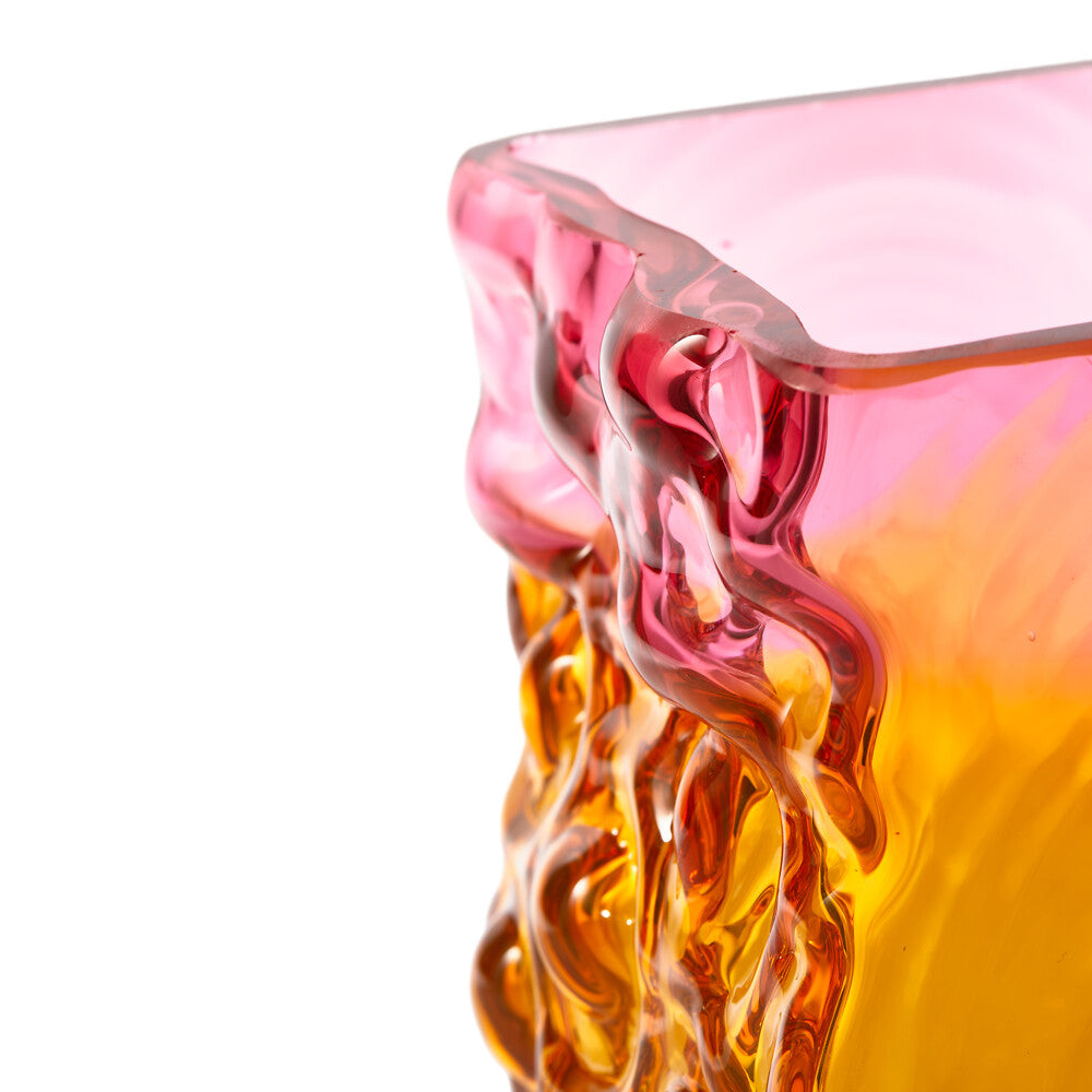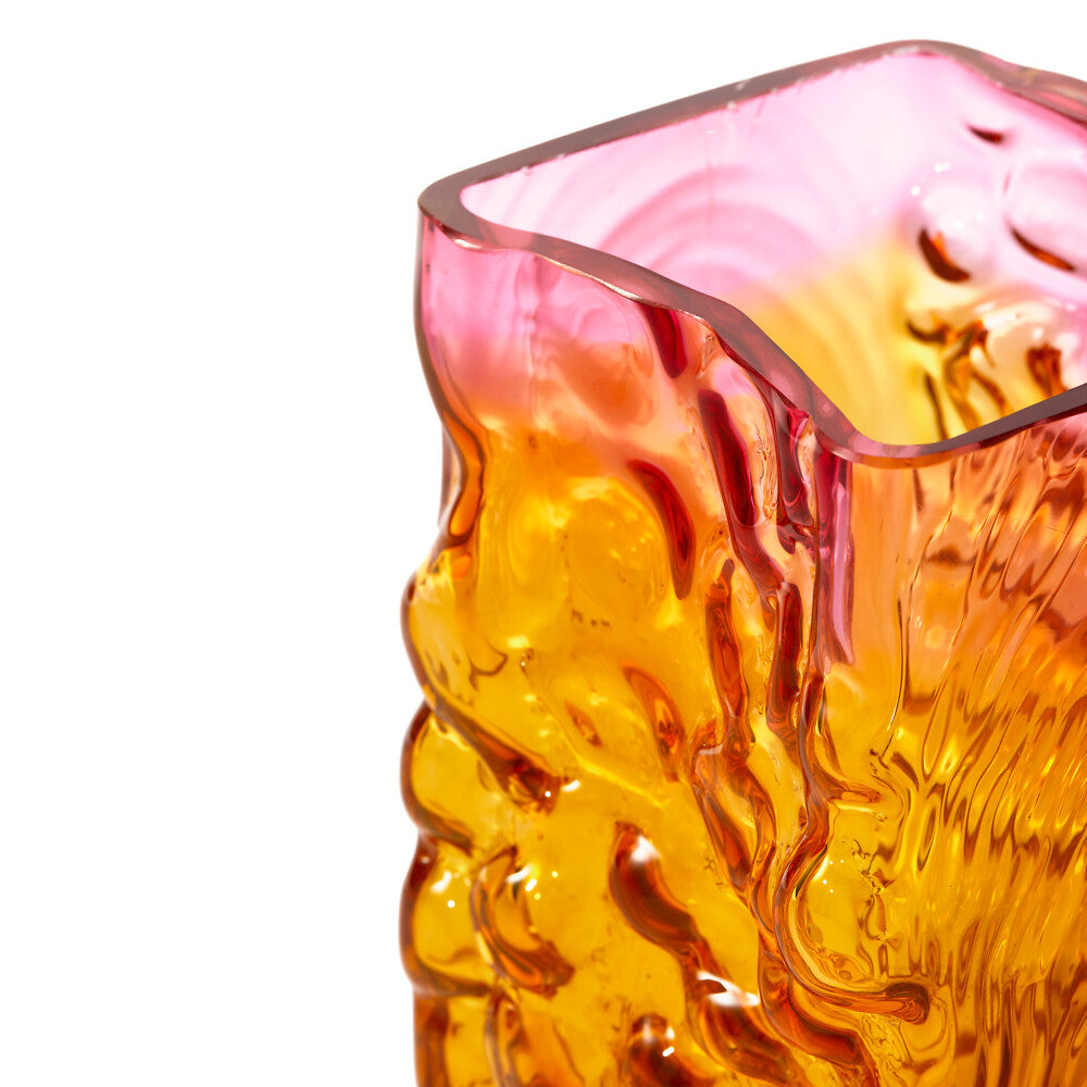 Drawing on the rugged essence of brutalist architecture, this unique vase commands attention with its robust, relief-shaped form. Hand-blown in ochre and pink glass, each vase showcases a one-of-a-kind bubble pattern, adding texture and a dash of whimsy. This statement piece doesn't just hold flowers; it breathes life into your living space.