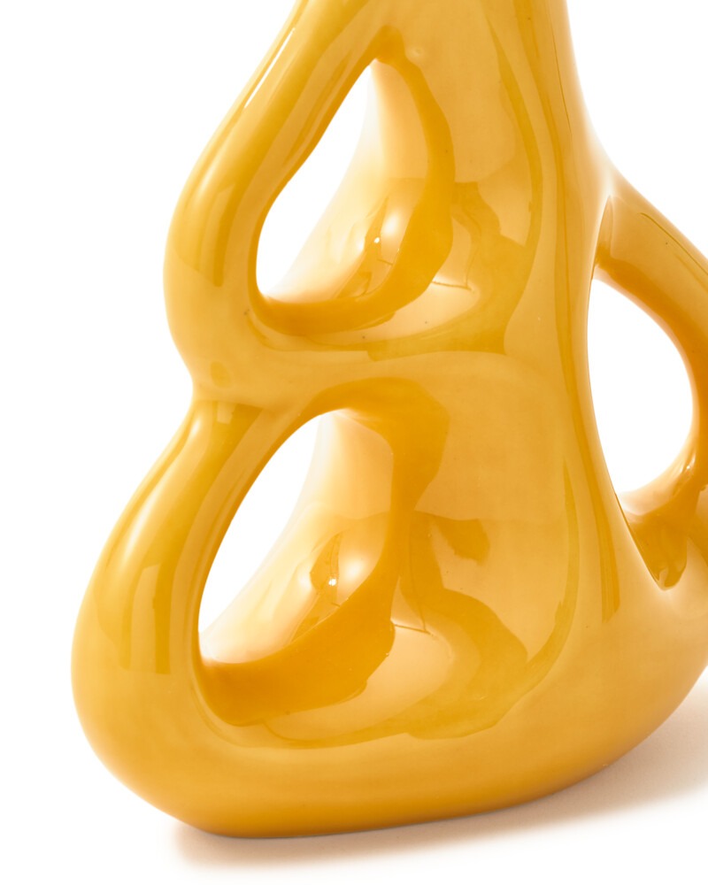 A new take on his previous work, Norman Trapman's reimagined design is crafted from glazed yellow ceramic, giving it a unique and eye-catching appearance. This versatile piece can be used functionally as a vase or purely as a decorative item, making it an excellent addition to any shelf or console table.