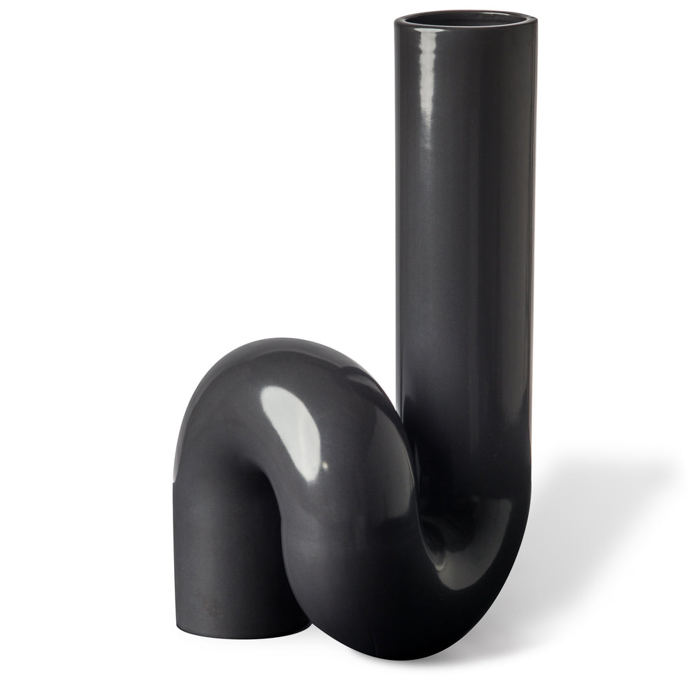 Crafted from black glazed ceramic, its sinuous silhouette captivates the eye with an illusion of fluidity, adding a bold, sculptural element to your interior design. The vase's dark hue provides a dramatic backdrop that either complements or contrasts with your choice of flowers, making it a versatile centrepiece.