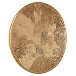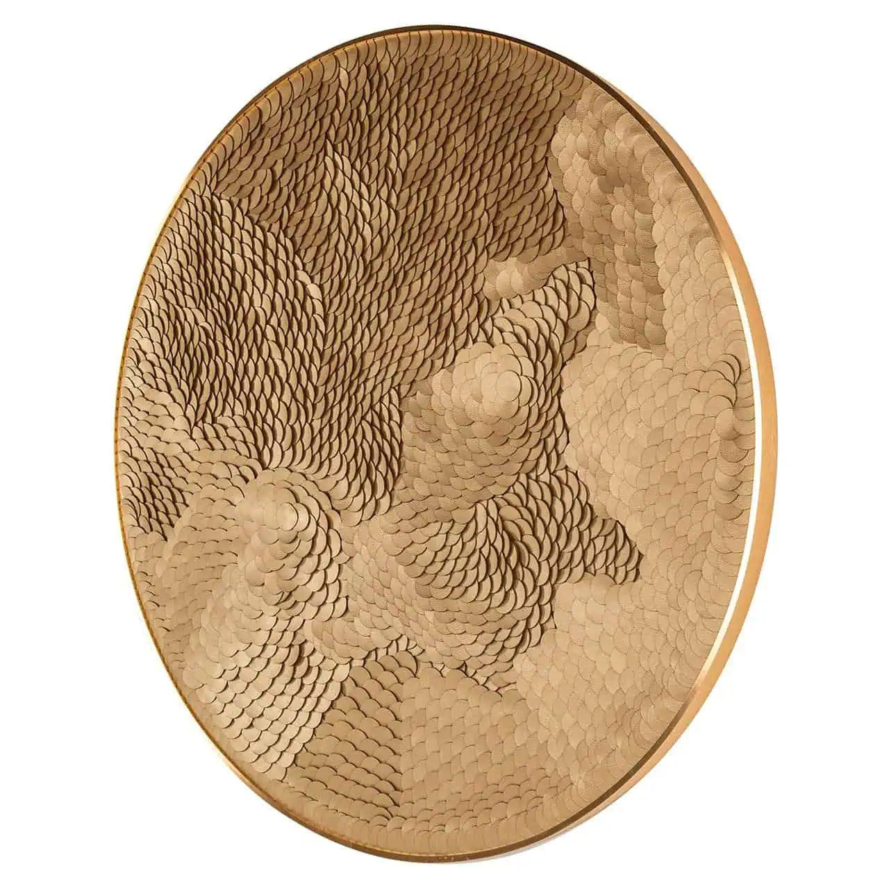 This art piece features a unique rounded silhouette, entirely adorned with shimmering golden discs that overlap in a meticulously crafted arrangement. These overlapping discs not only catch the light to create a mesmerising gleam but also build a rich sense of depth and texture.