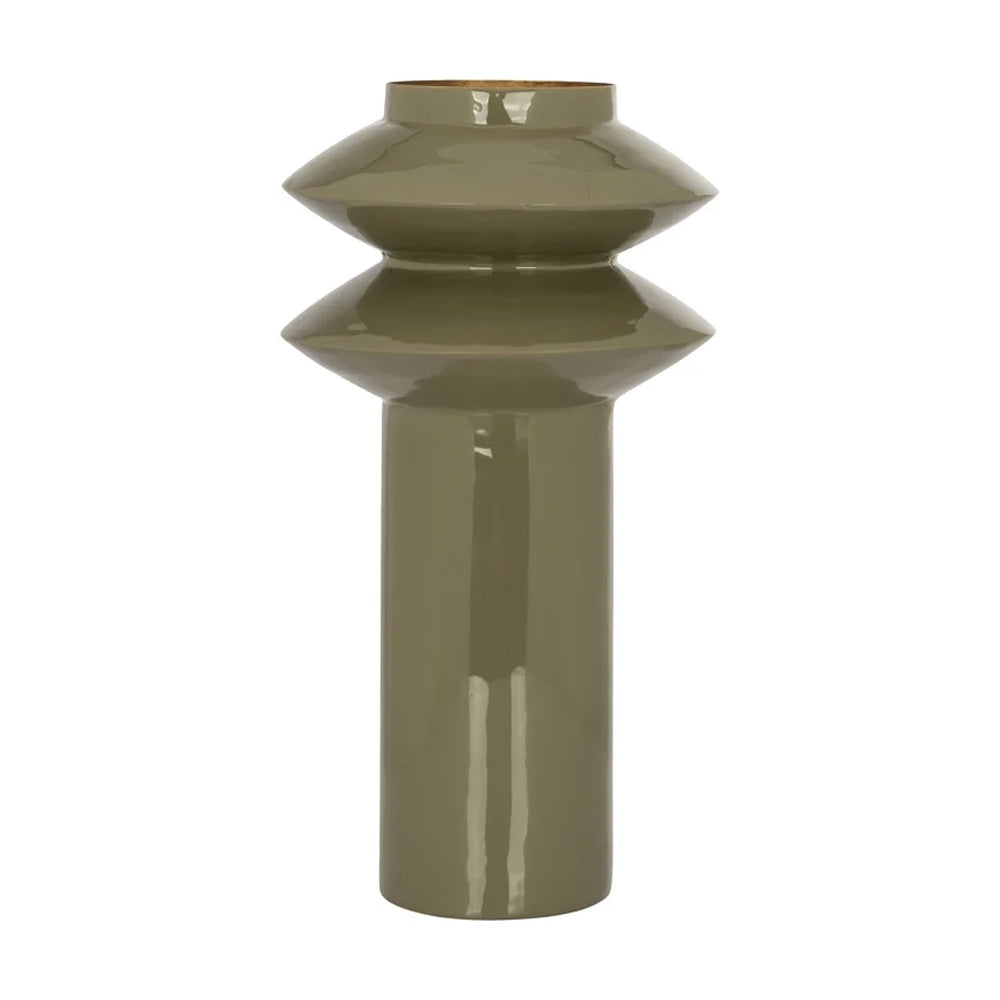 This distinctive vase is crafted from durable iron, featuring a slender cylindrical base that dramatically extends into an eye-catching zig-zagged top. Finished in a beautiful olive-green hue, it adds a playful yet sophisticated element to any room.