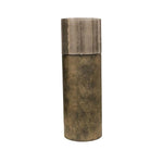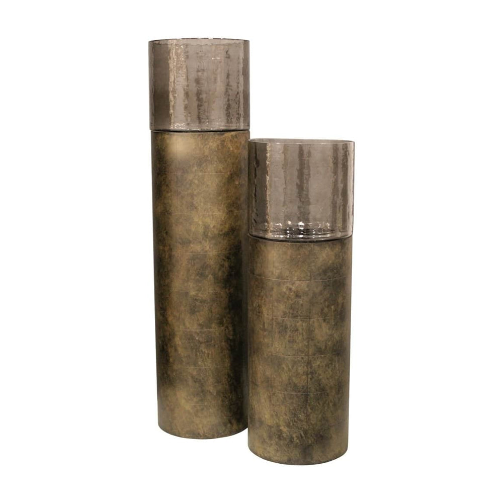 Crafted from a blend of textured glass and iron, it features a richly aged gold finish that brings warmth and character to any setting. Its tall cylindrical form creates a striking silhouette, perfect for holding candles or simply serving as a sculptural accent. Use it as a standalone centrepiece, or pair it with the smaller version for a cohesive, layered display.