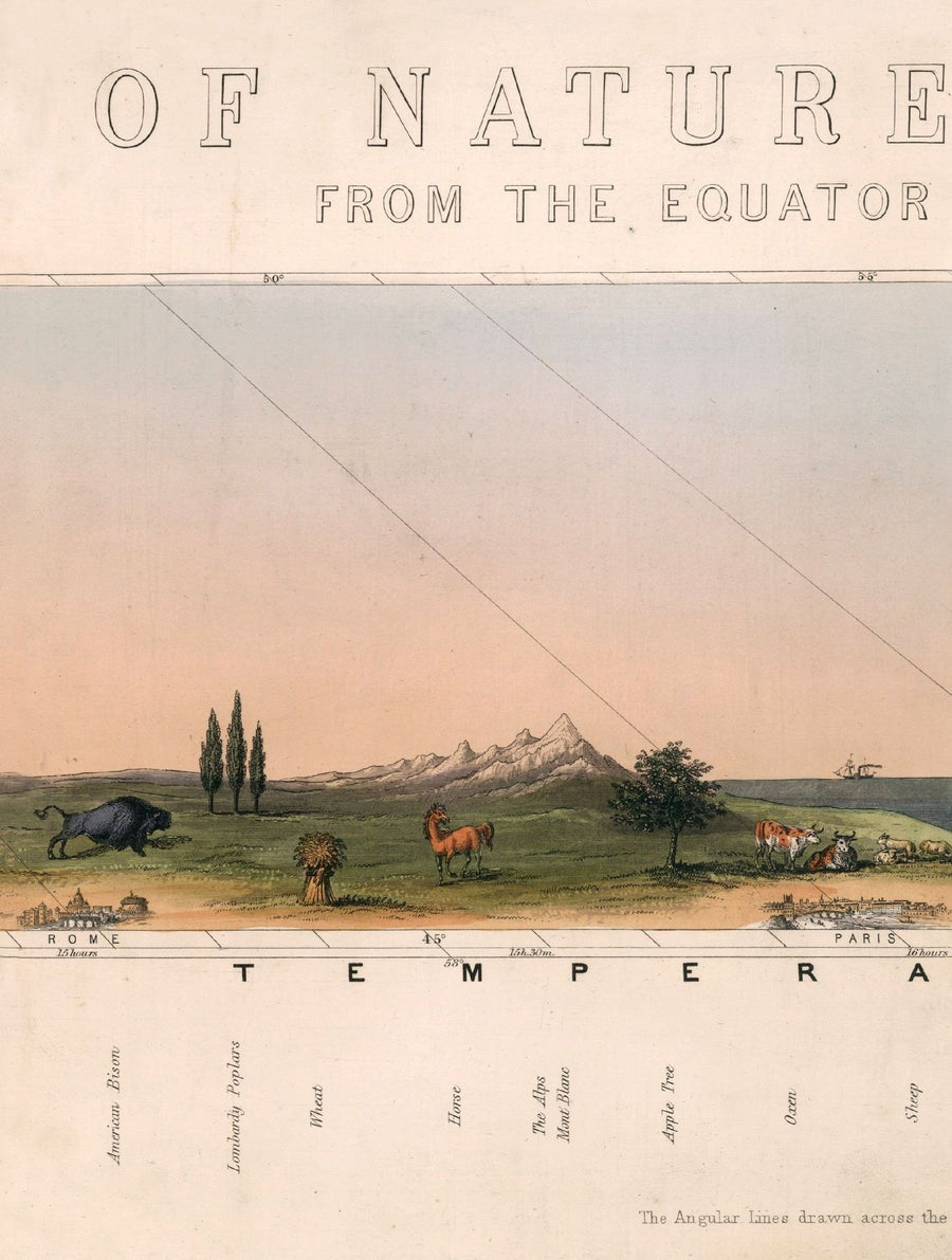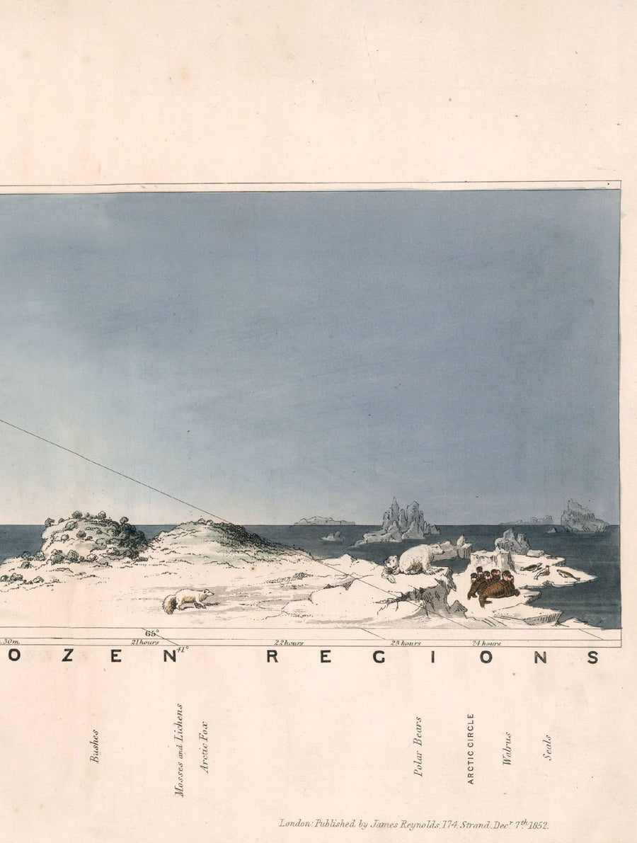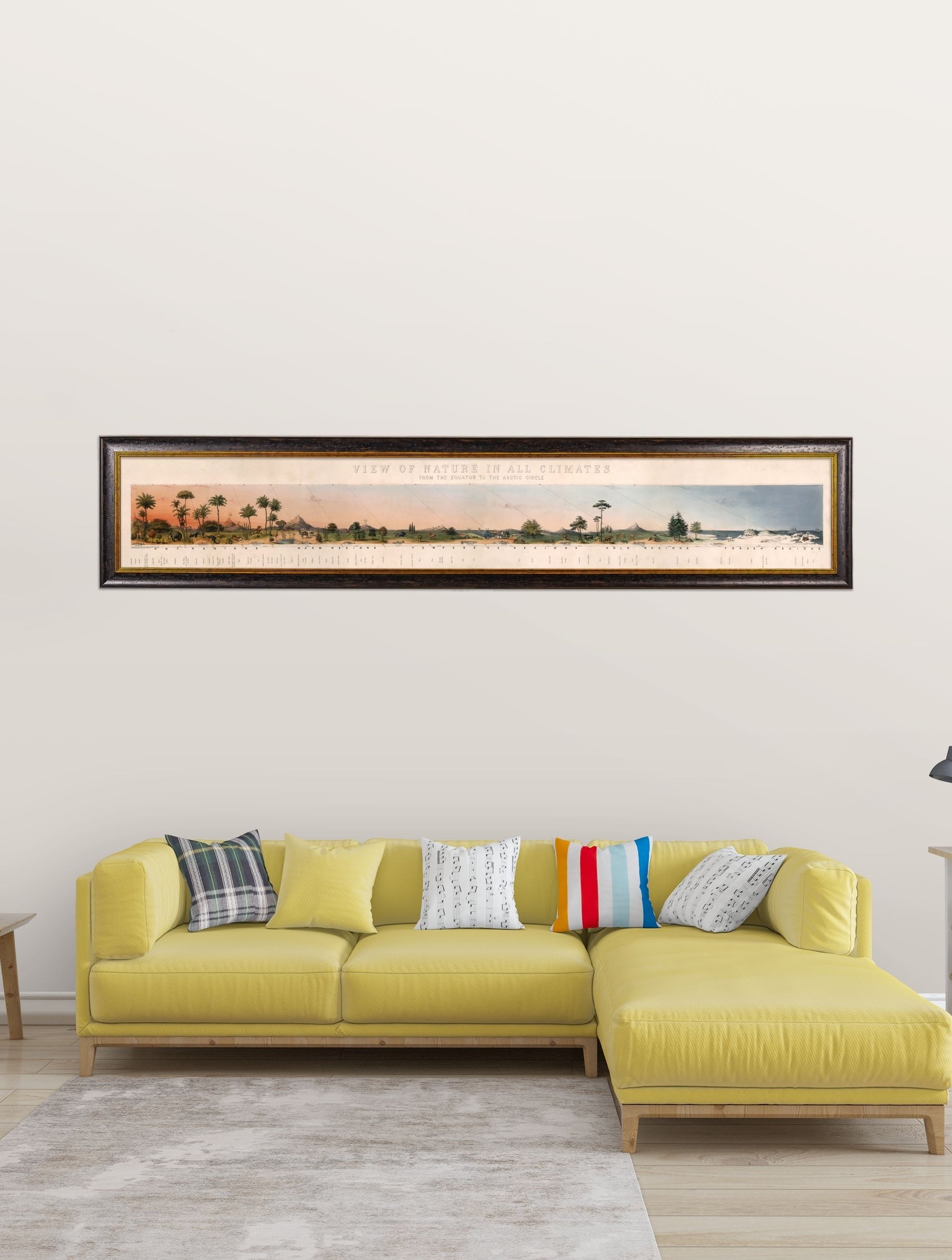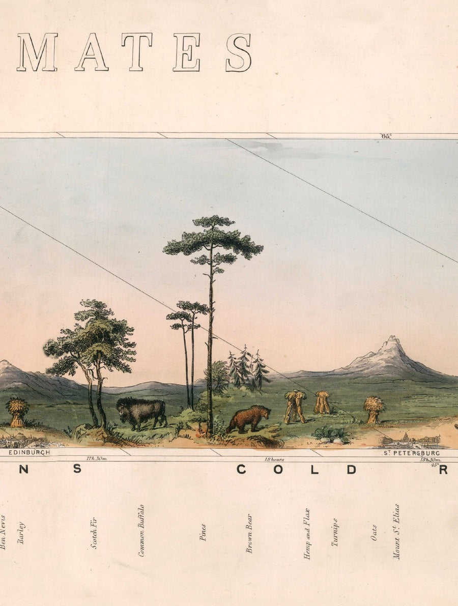 This piece, a digital restoration masterpiece, vividly showcases the unique flora and fauna native to various regions around the globe, complemented by annotations of cities and temperatures spanning its impressive length. A revival of an original mid-19th century illustration, originally rendered in black and white and later hand-painted to bring out its vibrant colours, this print is a testament to the beauty of our world.