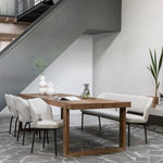 Made from recycled teak wood, it celebrates the beauty of nature with organic grain, knots and subtle imperfections that make every table feel truly unique. Strong, angular legs create a bold silhouette, ideal for anchoring open-plan dining spaces and relaxed family kitchens. The distinctive split tabletop adds a raw, architectural edge while keeping the overall look grounded and timeless.