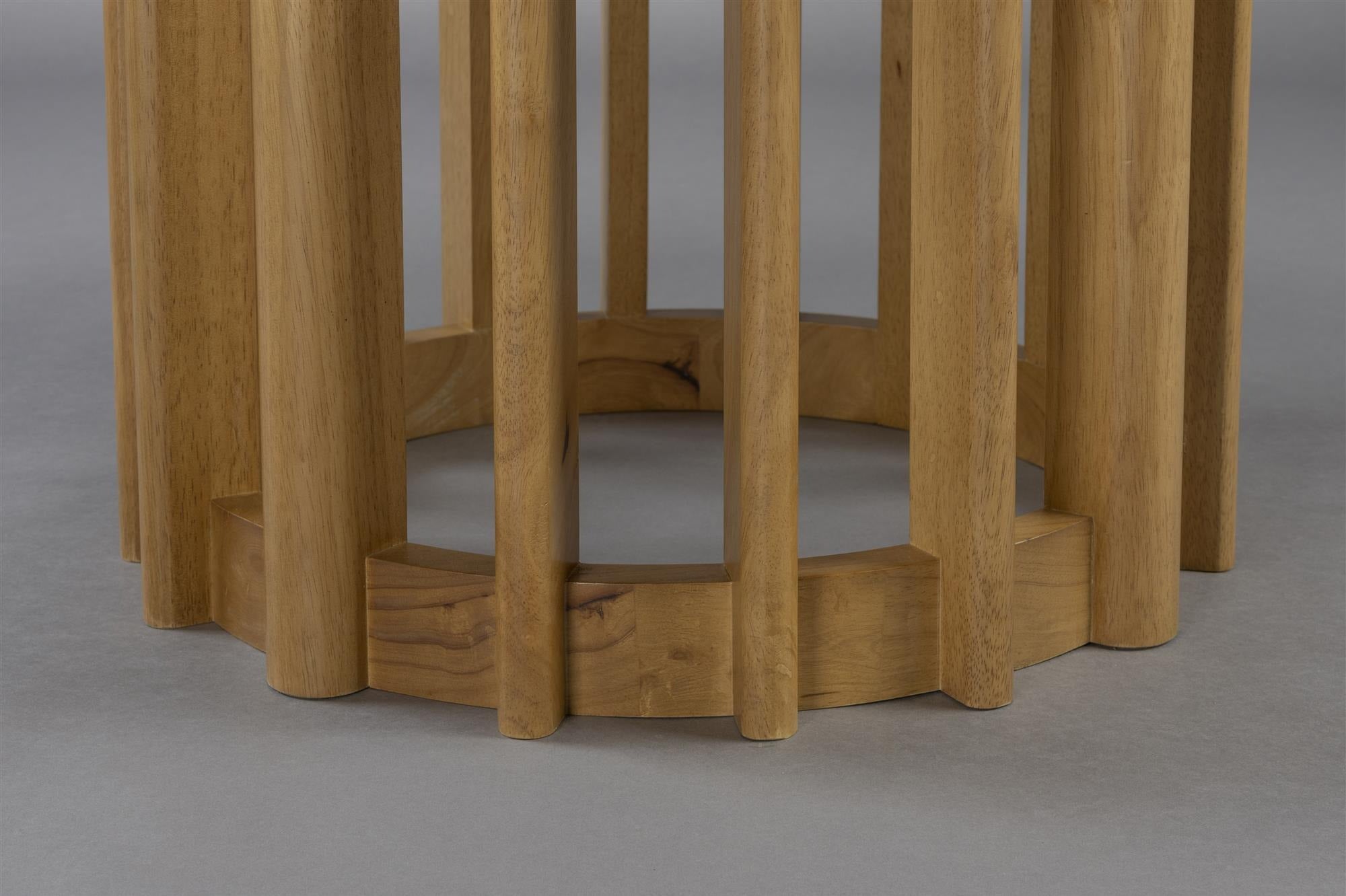 Crafted from durable rubberwood, its slatted base introduces lightness, visual rhythm, and architectural appeal. The rounded tabletop, made from oak veneer, impresses with its clean profile and rich natural grain. Finished in a light natural tone, it highlights the beauty of the wood, creating a warm, Scandinavian-inspired aesthetic that feels timeless and versatile.