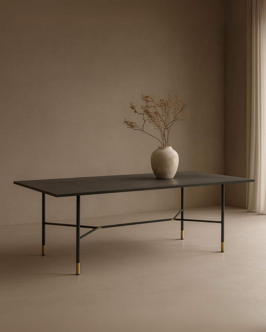 Resting on sleek legs capped with brass accents, it exudes refined elegance, while a cross-brace frame enhances both stability and visual interest. The spacious rectangular top, crafted from rich black oak, provides ample room, making it perfect for hosting large family meals or sophisticated dinner parties.