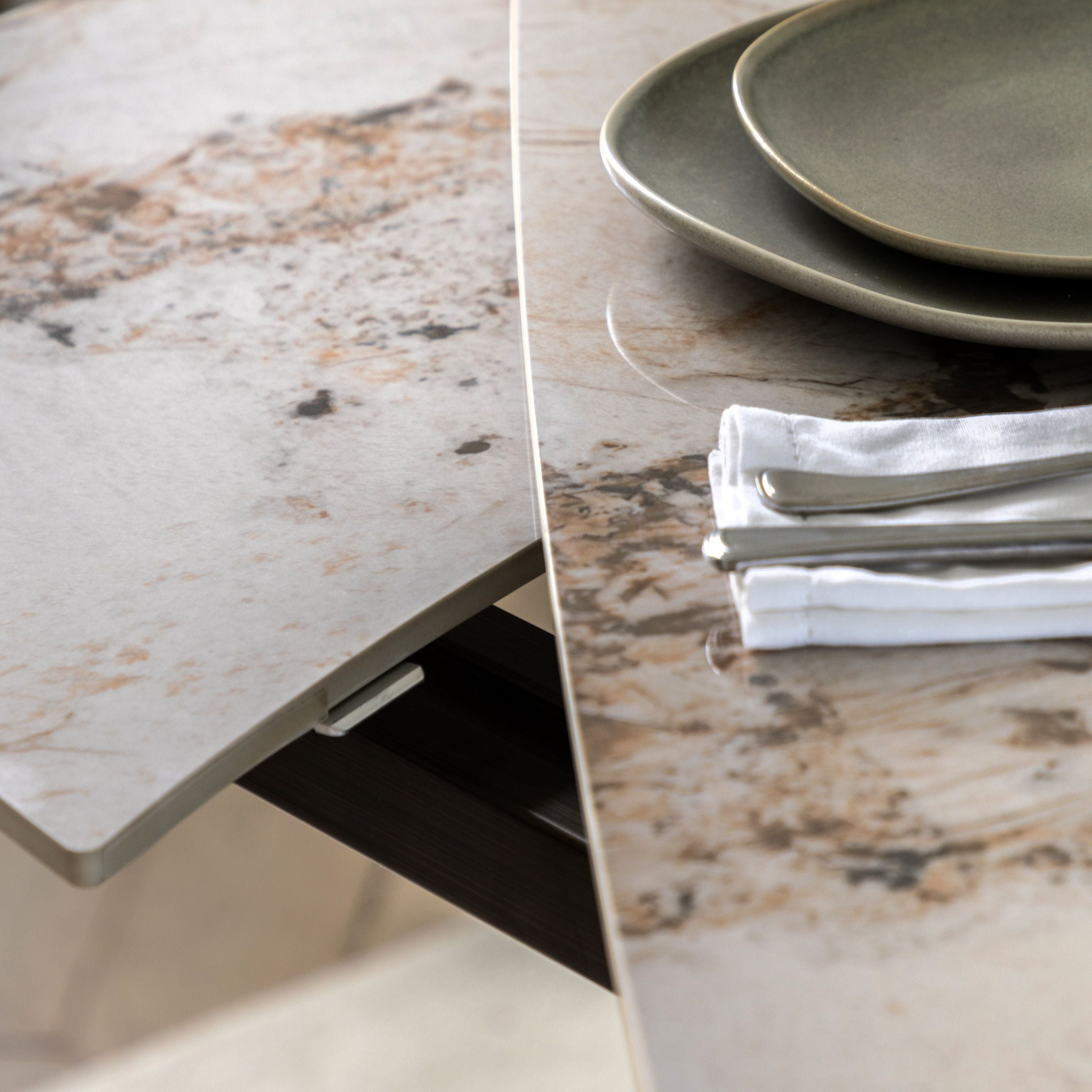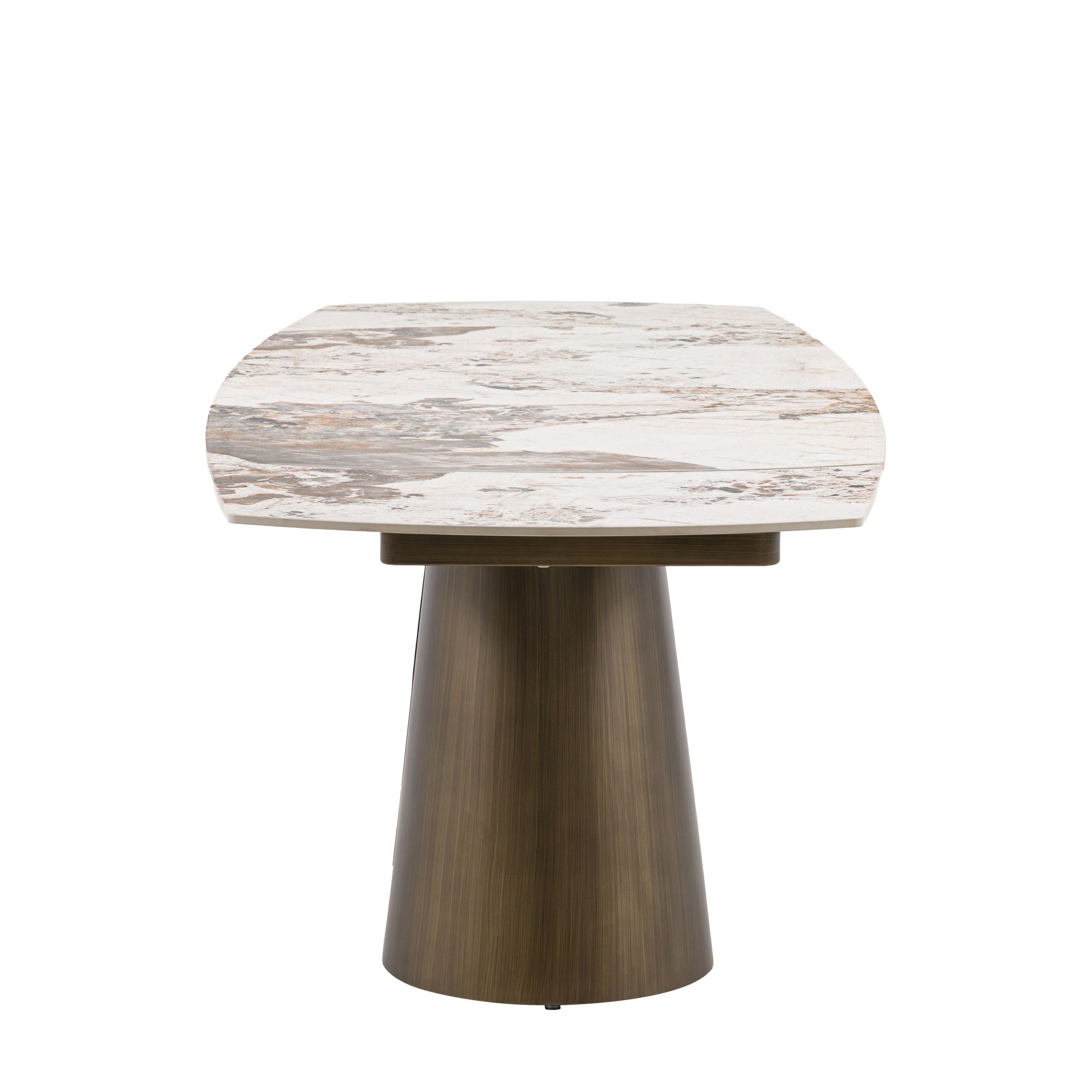 With its marble effect ceramic top, it offers the luxurious look of stone alongside a practical, easy clean surface that suits busy homes. The clever extending design increases the tabletop with ease, comfortably seating 6 to 8 people without compromising on style. Completing the look, a sculptural matt bronze metal base adds warmth and a contemporary architectural statement.
