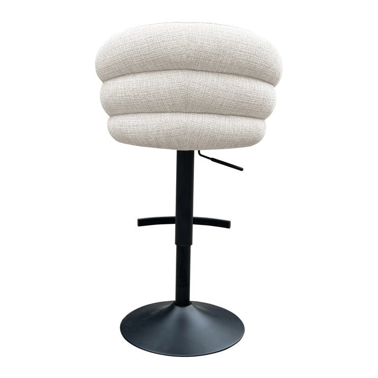 Featuring a sleek black iron pedestal base with an adjustable height mechanism, built-in footrest, and smooth swivel functionality, it combines stability and versatility. The plush seat, upholstered in luxurious beige chenille fabric, includes a curved backrest for support and deep channel-stitched detailing for added elegance.