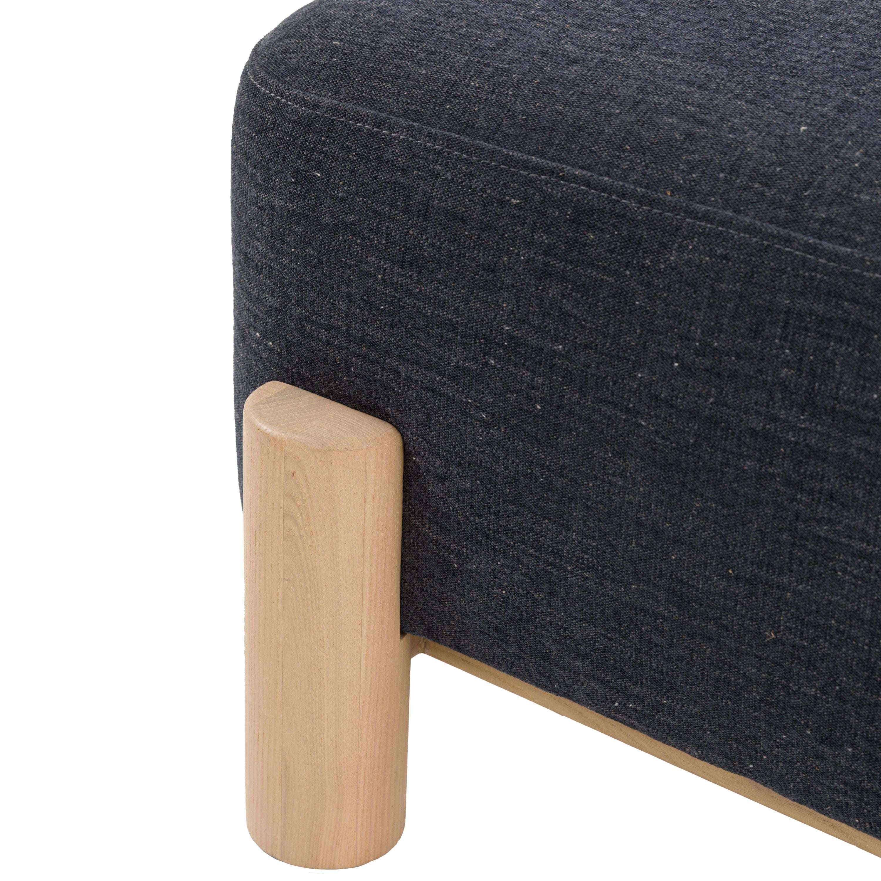 Upholstered in a dark blue fabric, it blends effortlessly with modern, Scandinavian and relaxed interiors, and pairs beautifully with the matching sofa and armchair for a cohesive look. Sturdy wooden legs in a light, natural finish add subtle organic warmth, while the generously padded seat works brilliantly as a footrest, occasional perch, or a soft surface for a tray.