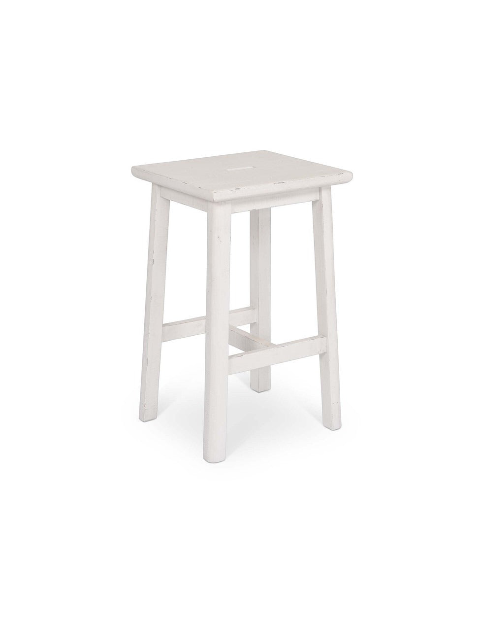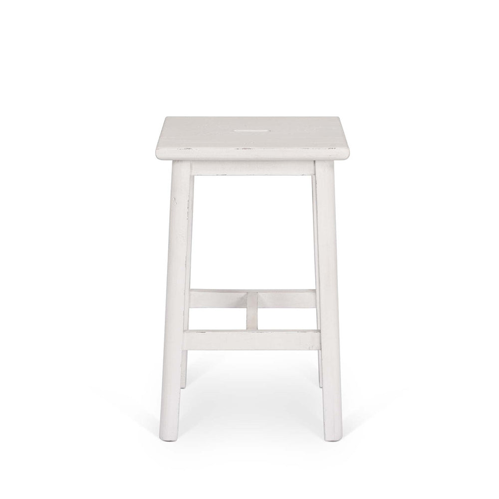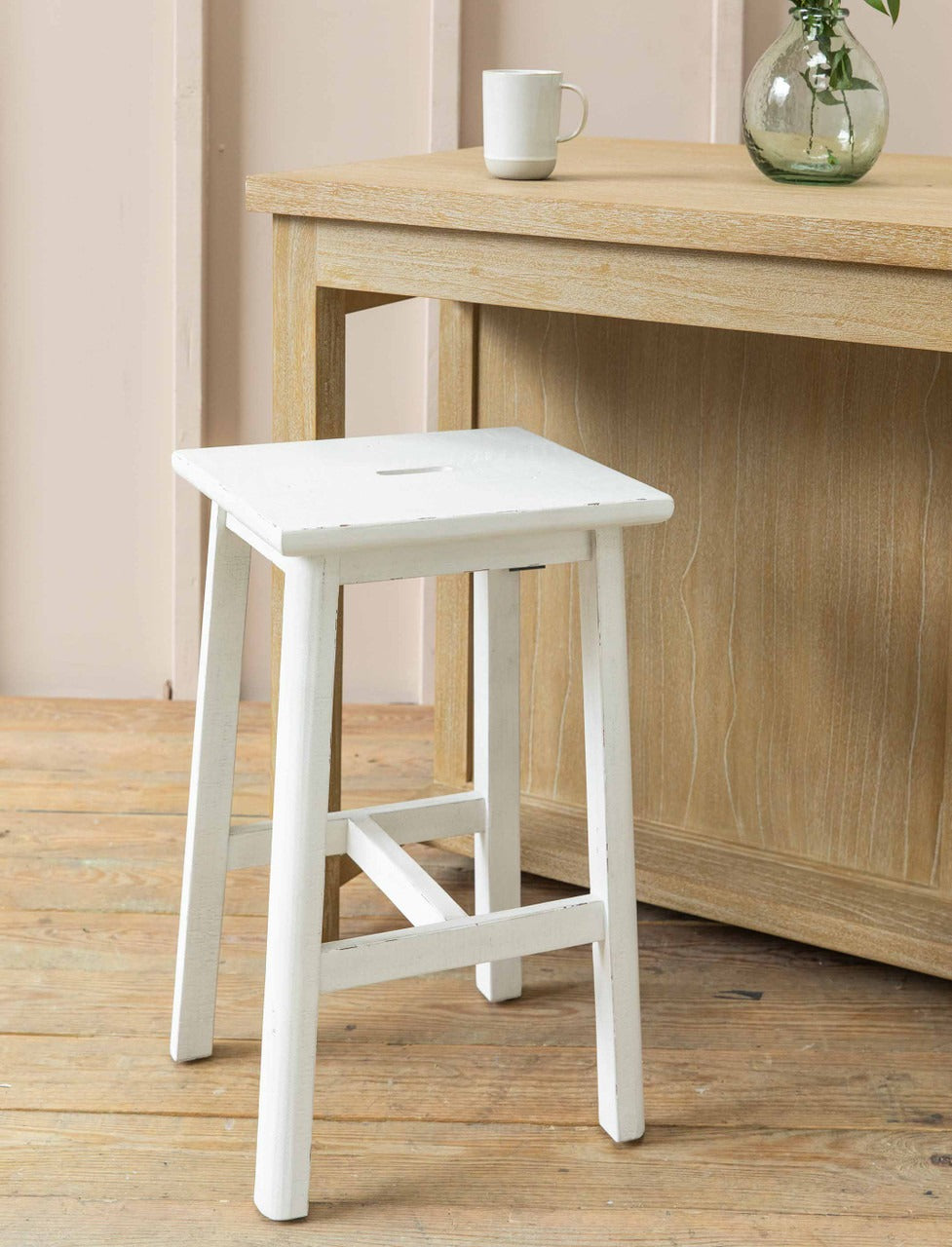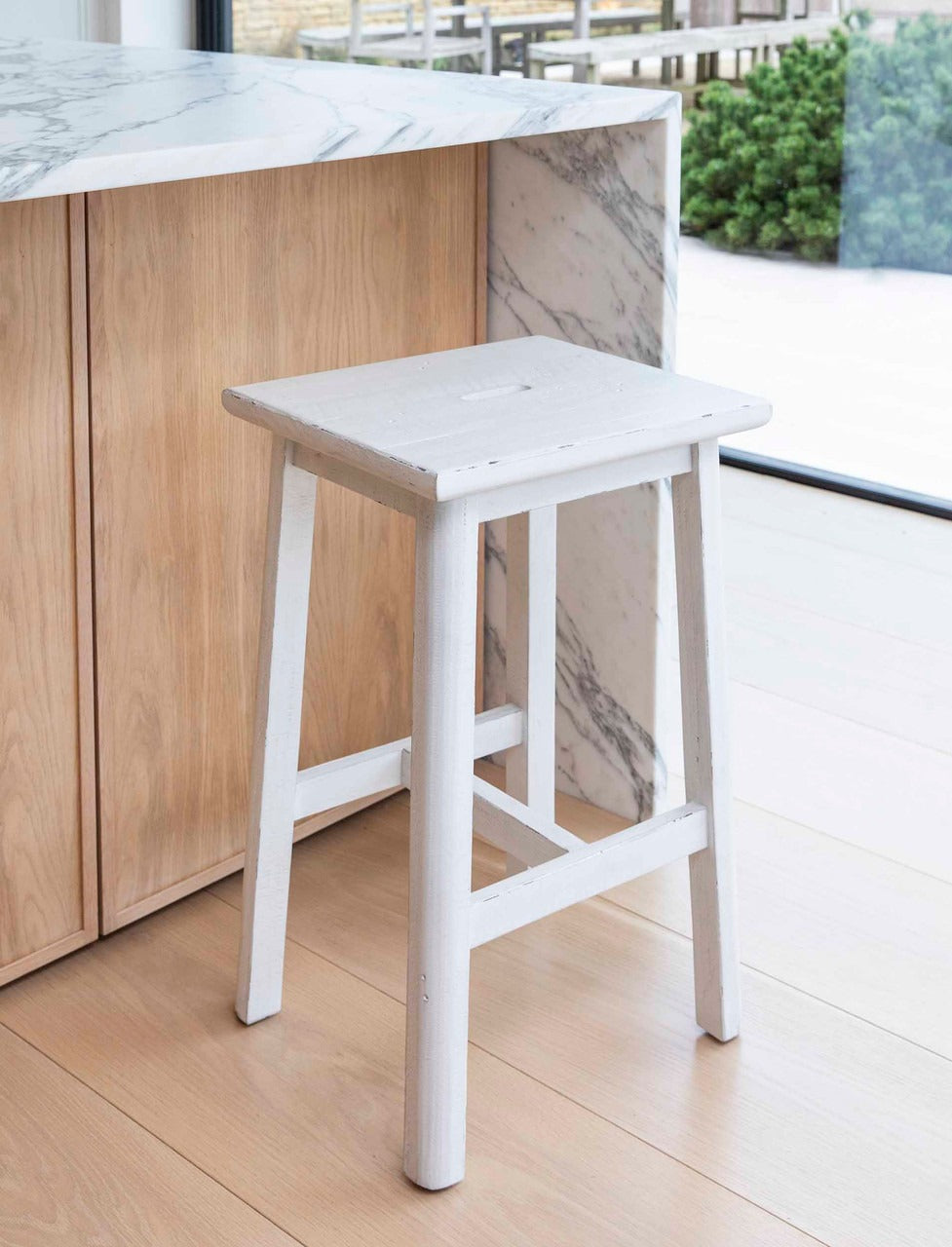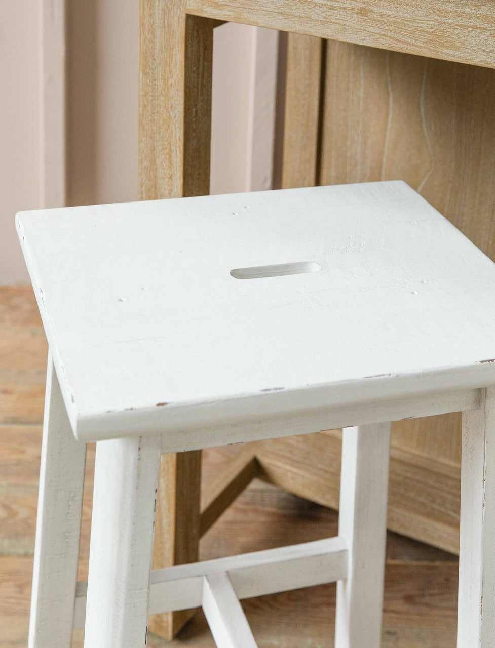 Made from reclaimed pine wood and treated to a white painted finish, this stool adds charm and character to any setting. With an integrated footrest, and a handle in the seat, it offers enhanced comfort and easy mobility.
