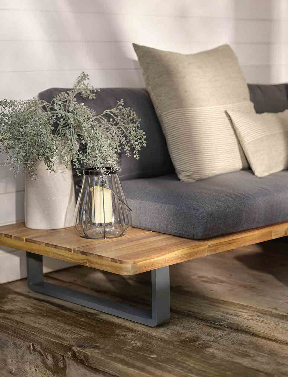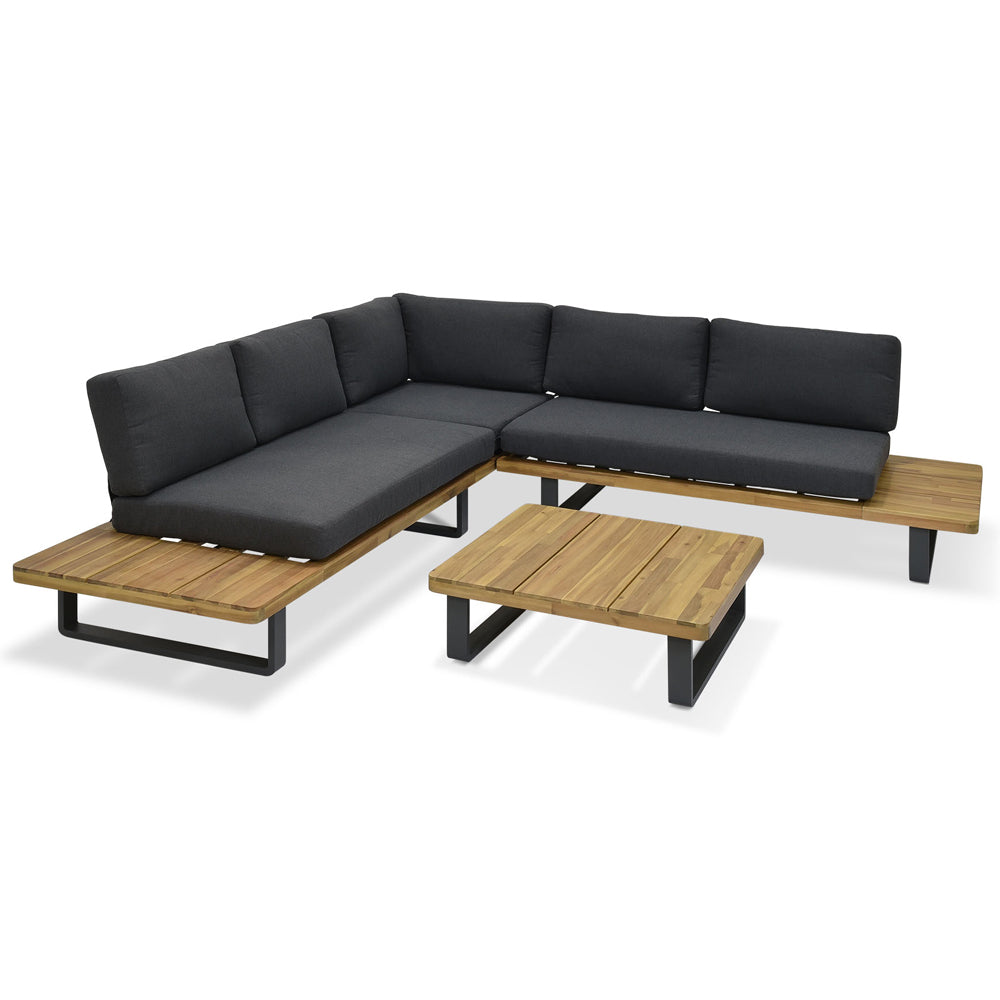Showcasing a perfect harmony of solid acacia wood and powder-coated aluminium, it blends modern style with an industrial flair and with plush padding on both the seat and back, it offers an inviting comfort that encourages leisurely relaxation. The sofa’s innovative design extends the wooden frame outwards at each end, creating handy table spaces for drinks or decorative pieces, enhancing its functionality. Additionally, the set comes with a matching coffee table, ensuring a cohesive look.