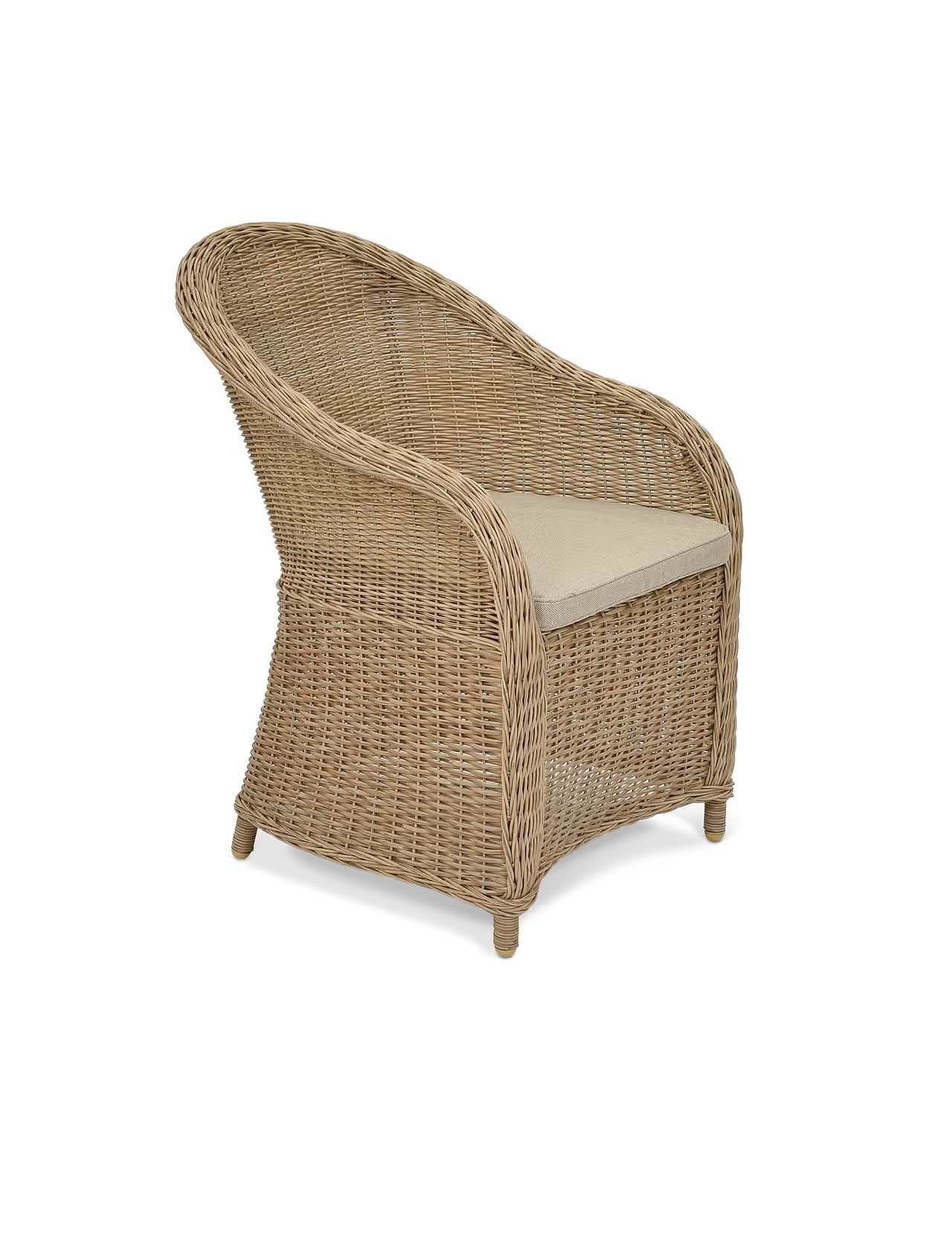 Designed with PE rattan, it features a gracefully curved silhouette that blends coastal and bohemian influences, highlighted by a warm natural finish and organic texture. The high, rounded backrest offers supportive comfort and a cocoon-like feel, while the plush neutral cushion enhances relaxation.