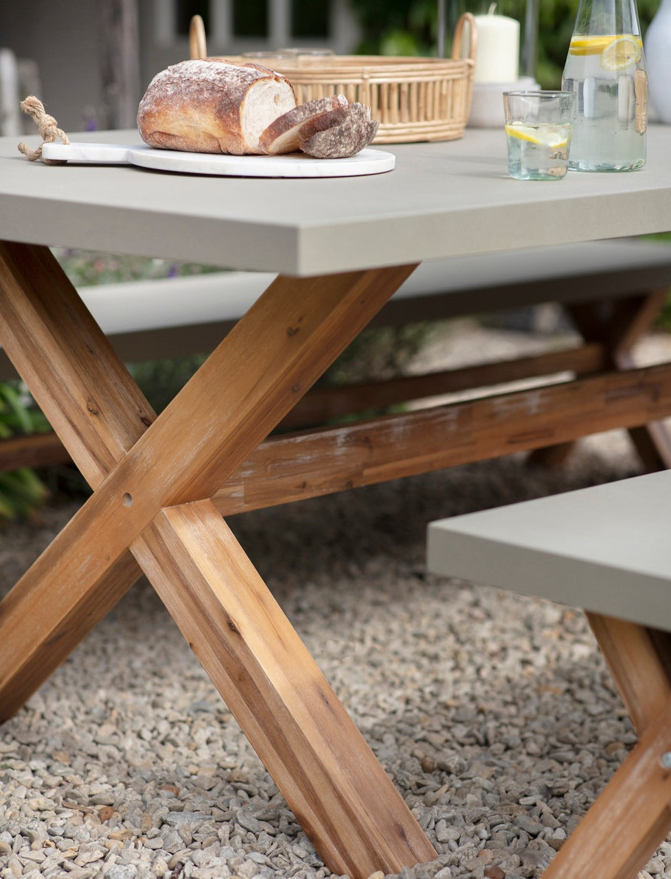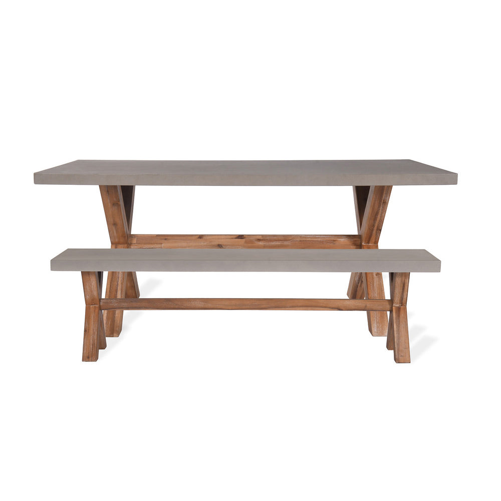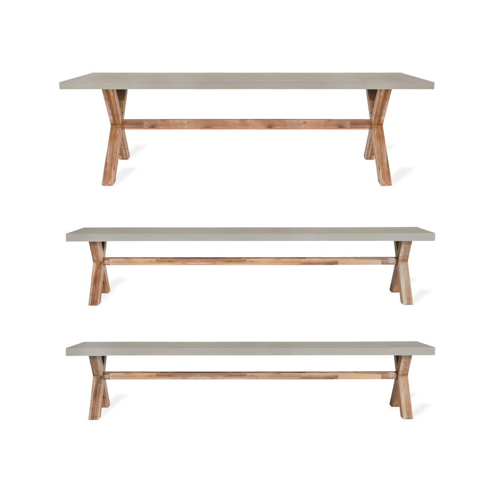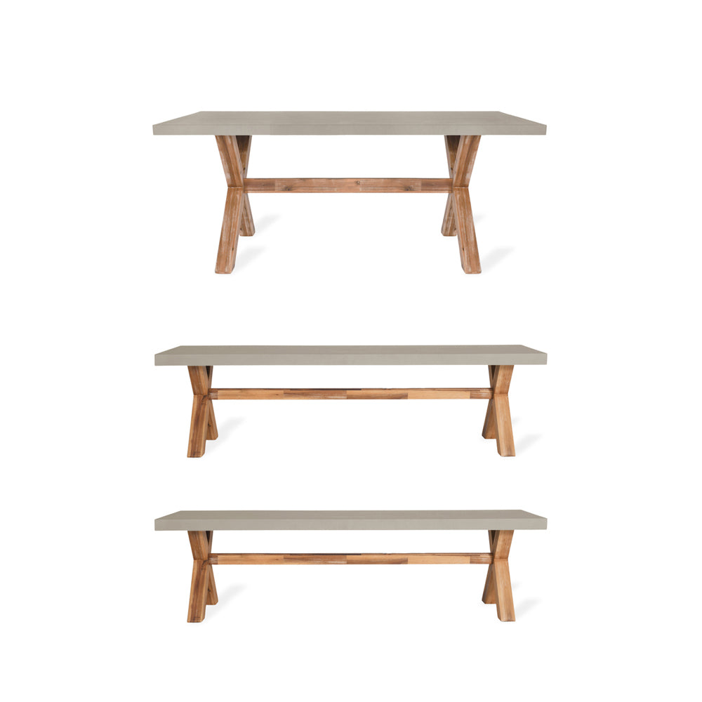 This set includes a dining table and two benches, each boasting contemporary criss-cross bases crafted from solid acacia wood to ensure both durability and style. The seats and tabletop are made from polystone, offering a sleek and weather-resistant surface that's ideal for any outdoor setting.