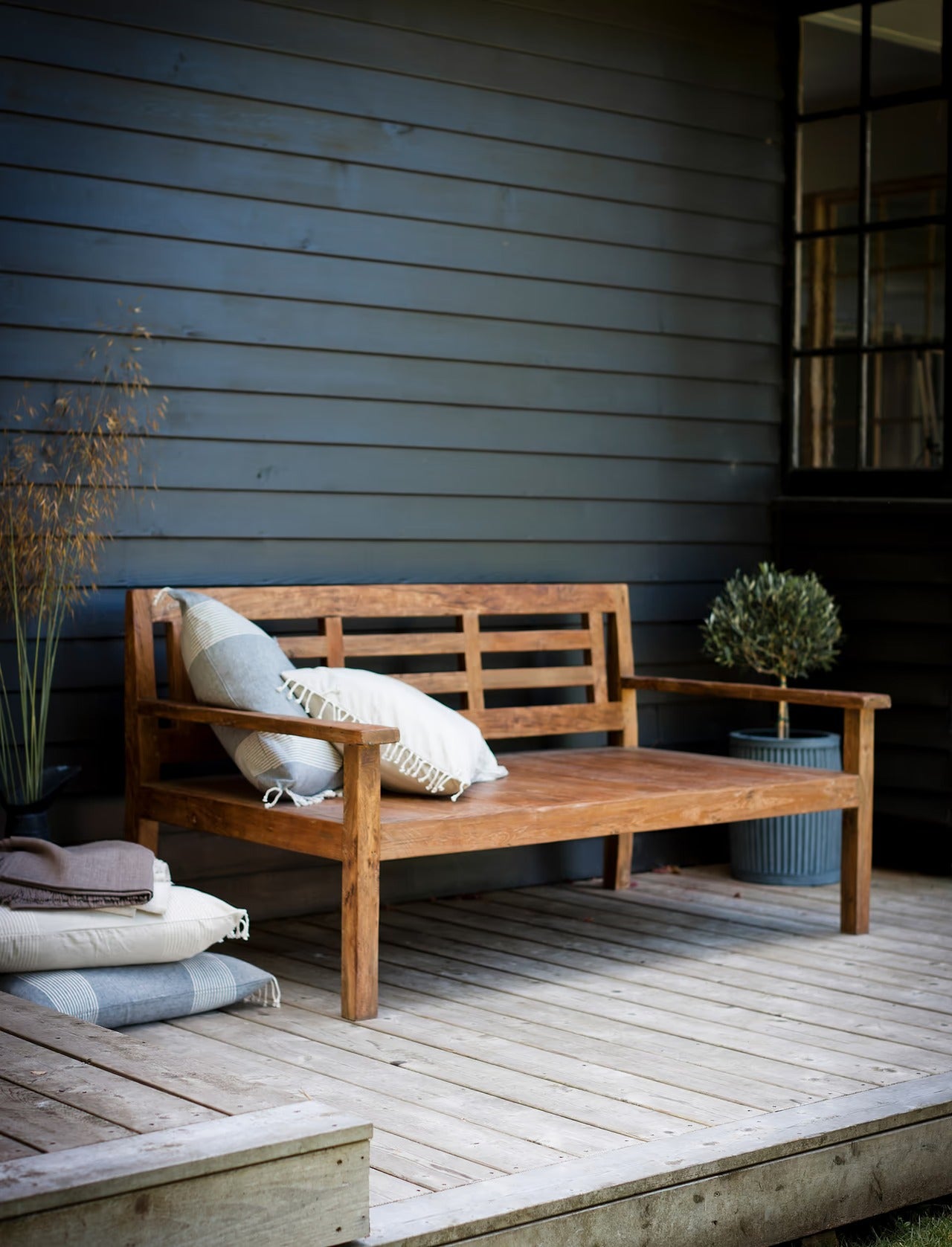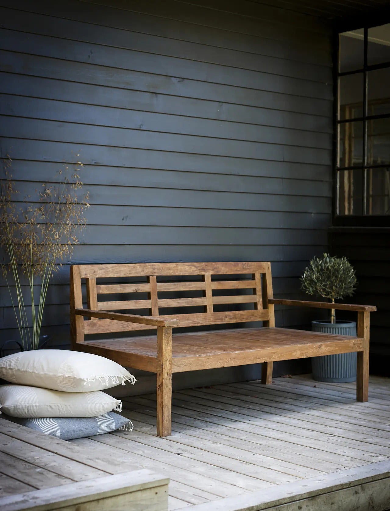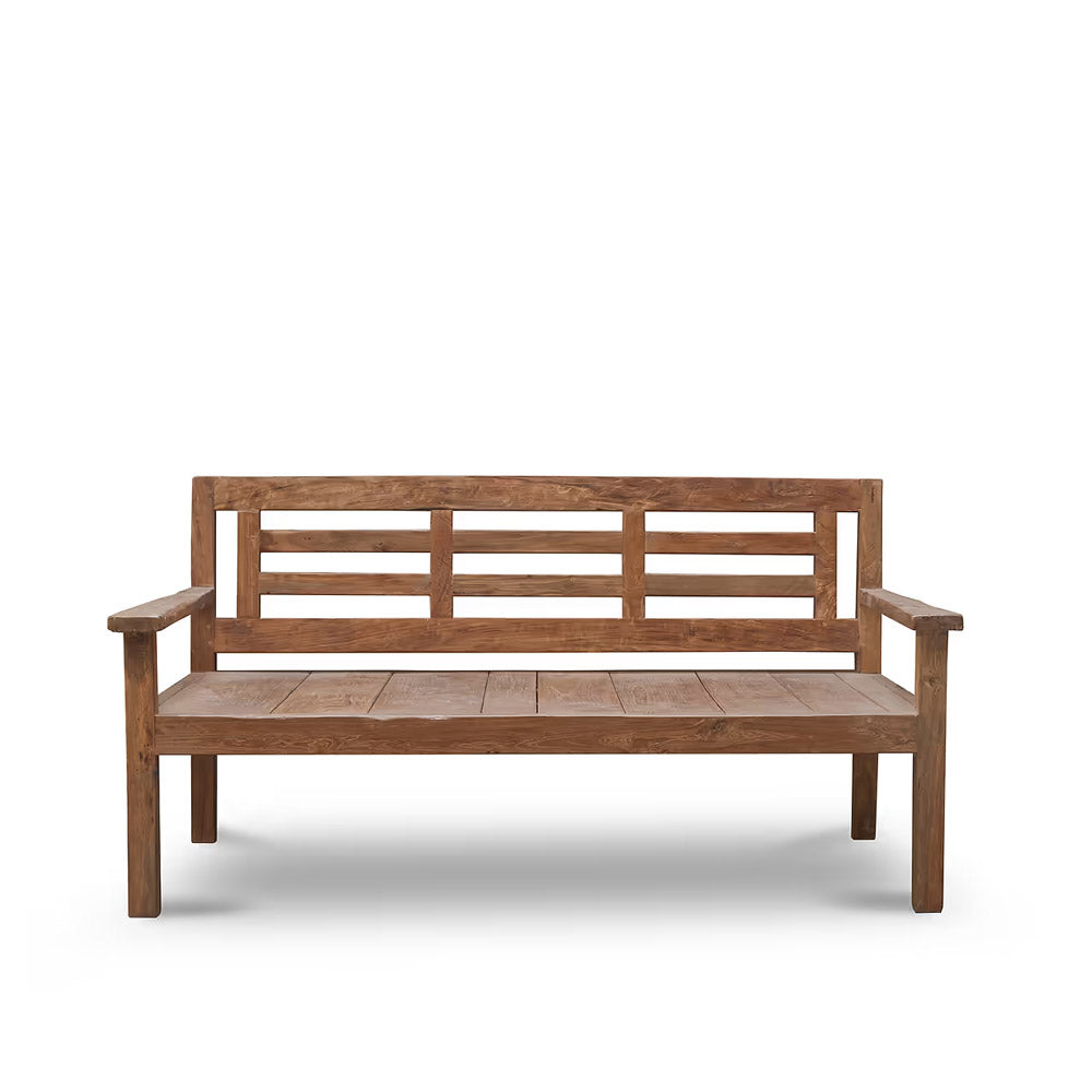 Its sleek, minimalist design and sturdy reclaimed teak wood construction ensure durability while exuding timeless elegance. The slatted back enhances its airy aesthetic and complements the clean, streamlined silhouette.